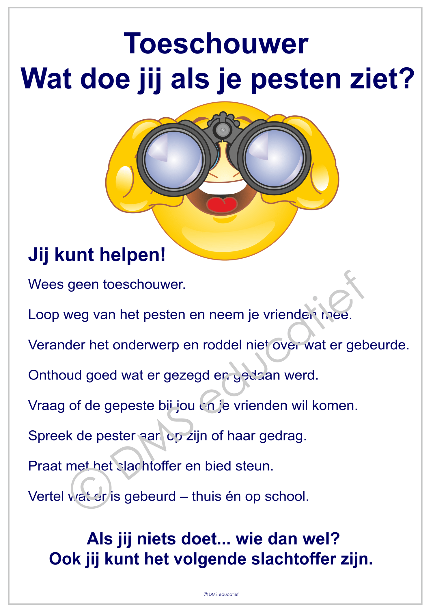 Dit krachtige en overzichtelijke A3-affiche is speciaal ontworpen om leerlingen bewust te maken van hun rol als toeschouwer bij pesten. Met korte, duidelijke aanwijzingen worden kinderen aangemoedigd om in actie te komen, steun te bieden aan het slachtoffer en pesten niet te accepteren. Een echte blikvanger voor in de klas, op de gang of in de schoolbibliotheek – ideaal als aanvulling op lessen rond sociaal gedrag, groepsvorming of tijdens de Week tegen Pesten.