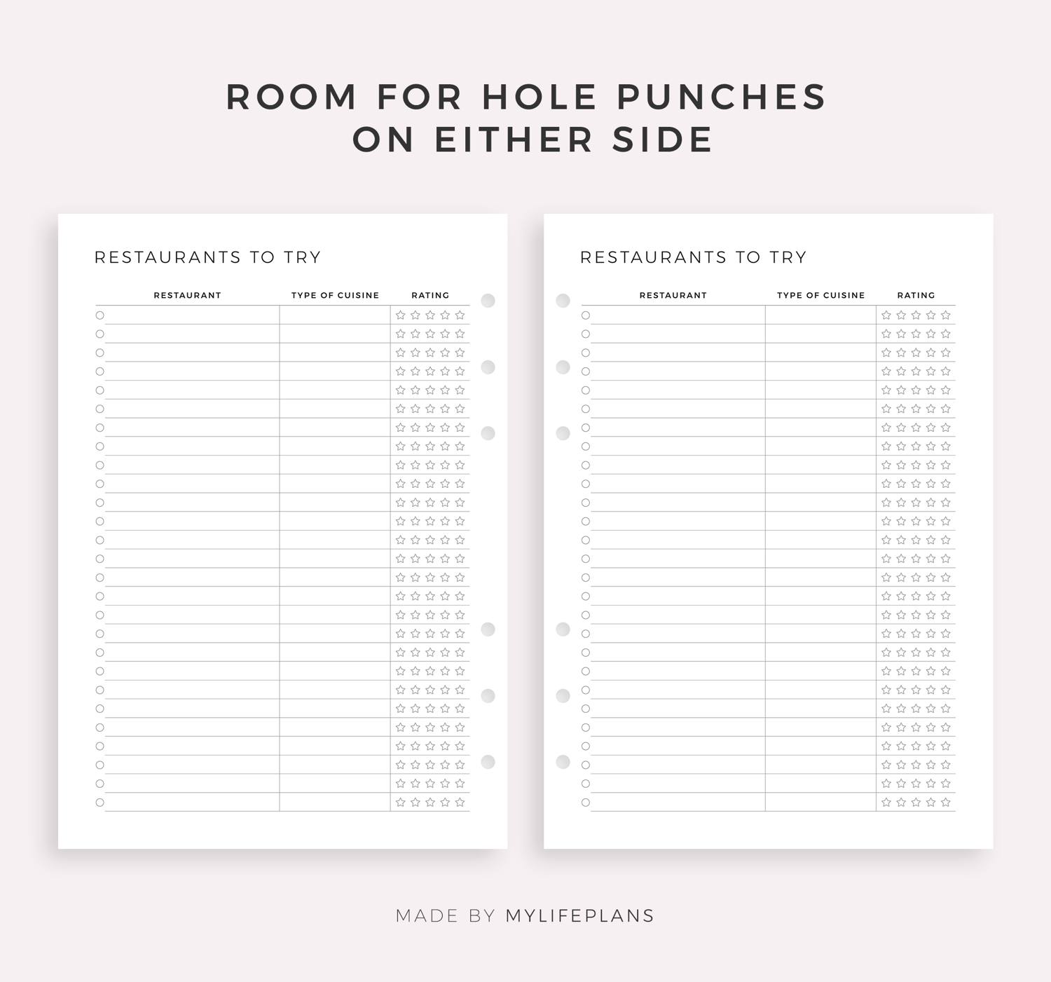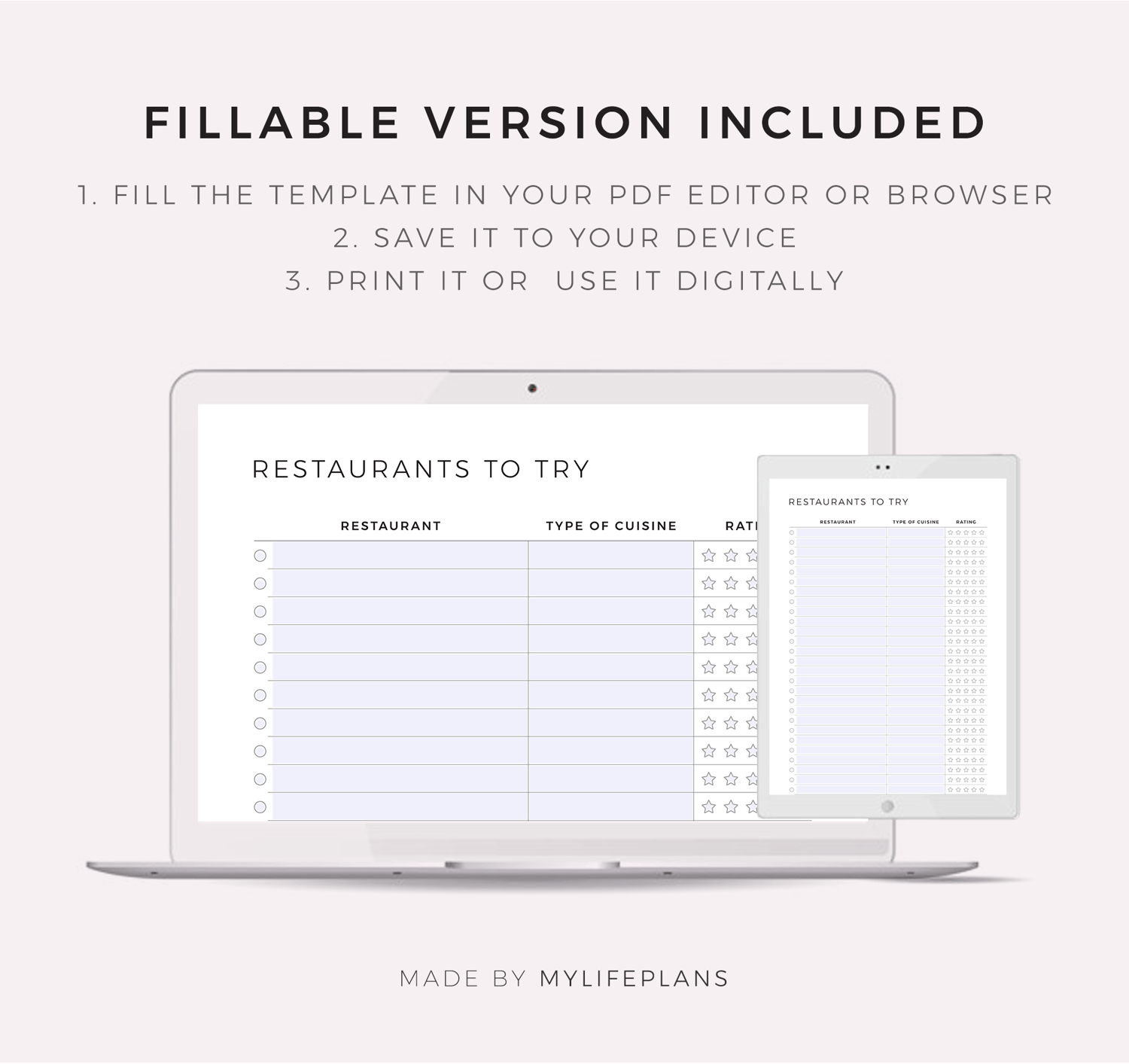 Restaurants to Try Planner, Printable & Fillable PDF, A4/Letter Size, Instant Download