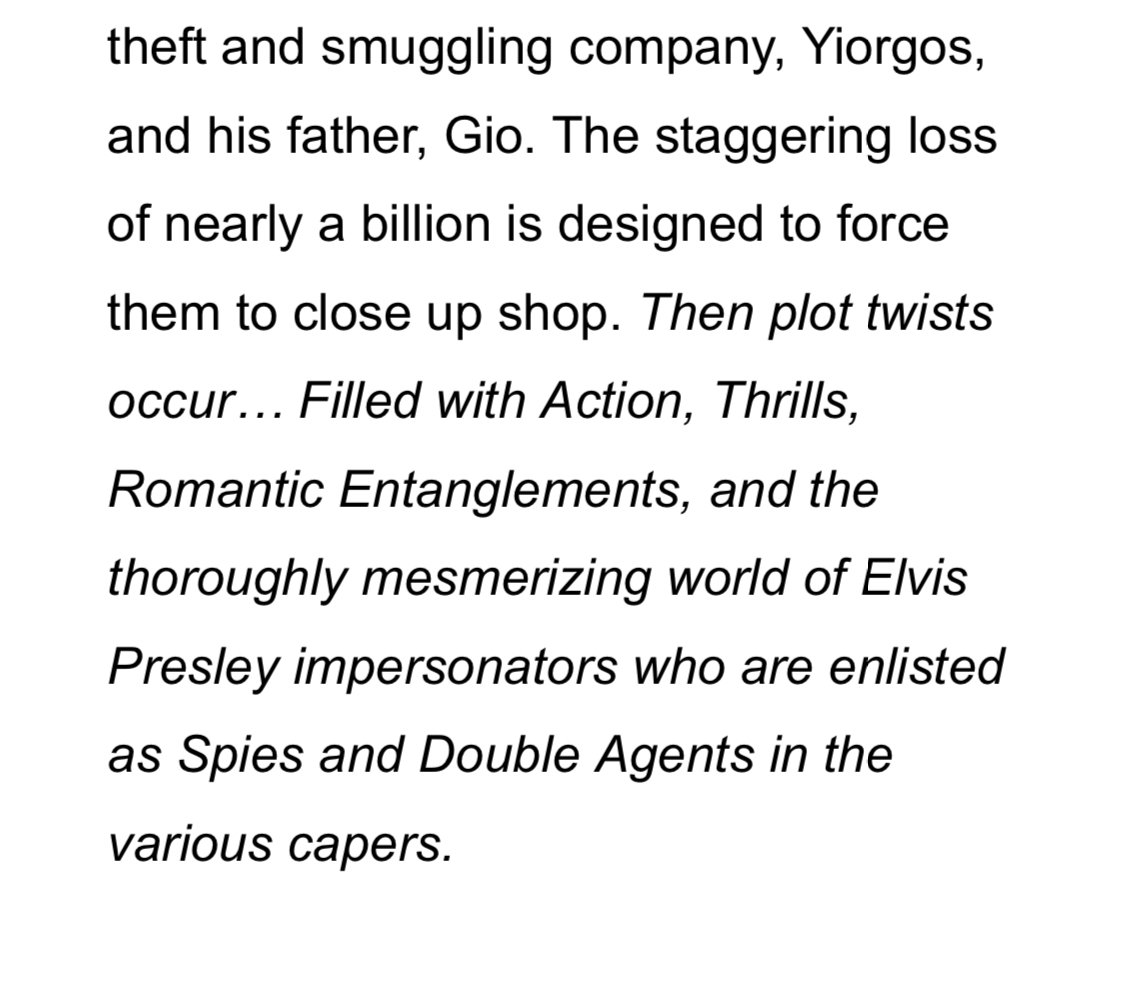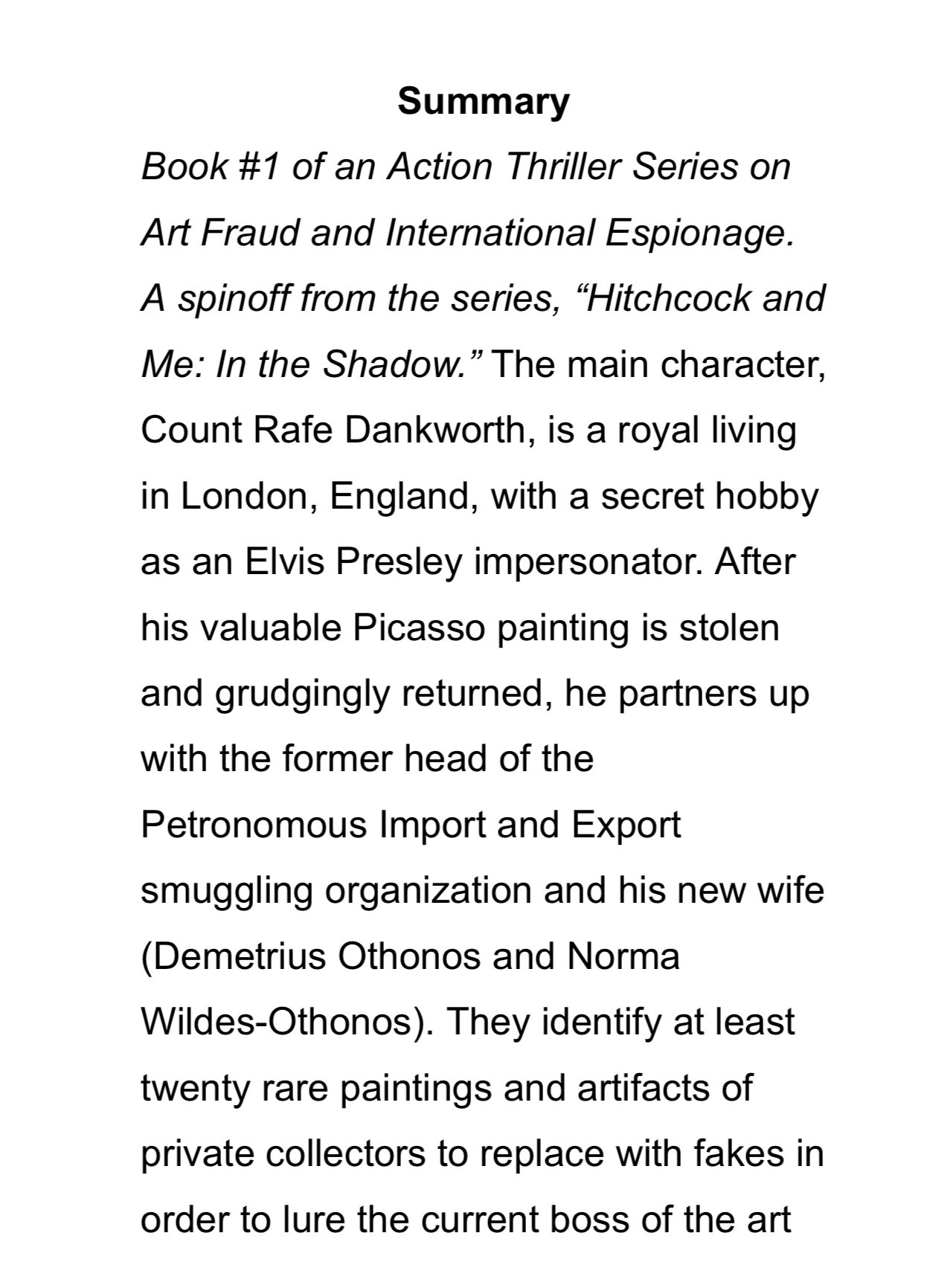 Book #1 of an Action Thriller Series on Art Fraud and International Espionage (Remaining books on Amazon, BarnesandNoble.com, NOOK, Paperback, etc). A spinoff from the series, “Hitchcock and Me: In the Shadow.” The main character, Count Rafe Dankworth, is a royal living in London, England, with a secret hobby as an Elvis Presley impersonator. After his valuable Picasso painting is stolen and grudgingly returned, he partners up with the former head of the Petronomous Import and Export smuggling organization and his new wife (Demetrius Othonos and Norma Wildes-Othonos). They identify at least twenty rare paintings and artifacts of private collectors to replace with fakes in order to lure the current boss of the art theft and smuggling company, Yiorgos, and his father, Gio. The staggering loss of nearly a billion is designed to force them to close up shop. Then plot twists occur… Filled with Action, Thrills, Romantic Entanglements, and the thoroughly mesmerizing world of Elvis Presley impersonators who are enlisted as Spies and Double Agents in the various capers.
