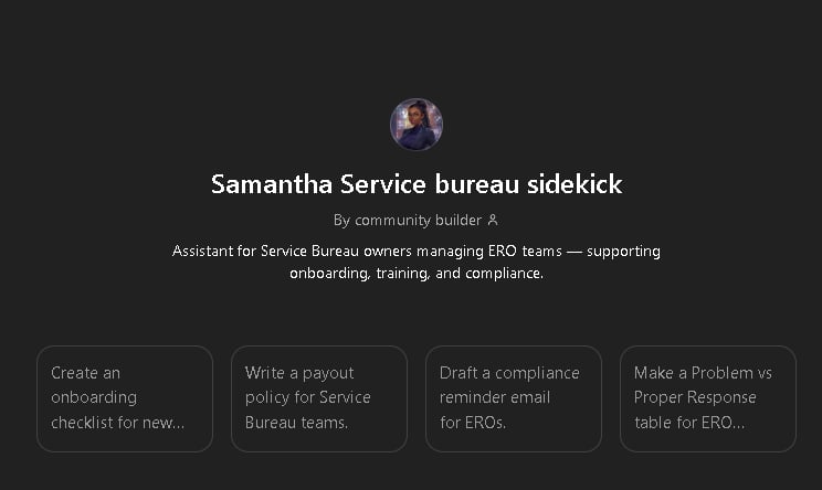 Run your tax office like a pro with Samantha Service Bureau Sidekick ChatGPT AI Bot! πΌπ€ This smart virtual assistant helps service bureau owners manage tasks, support EROs, and streamline daily operations. Stay organized, efficient, and in control β no template needed!