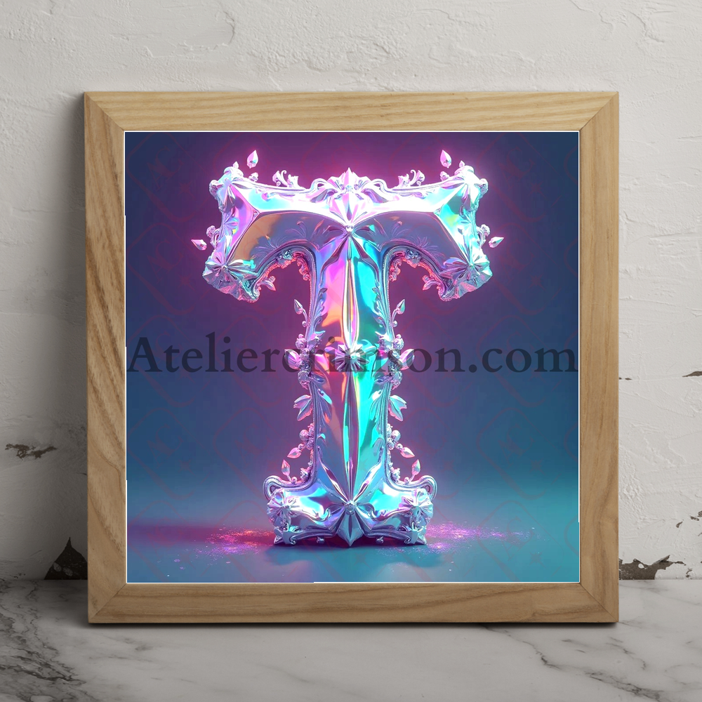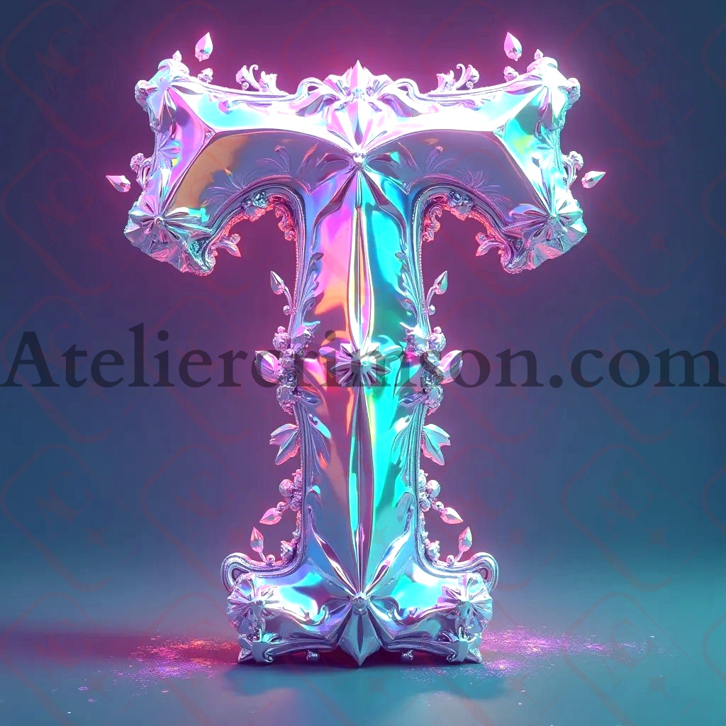 The letter T crystalline Retro Futuristic C A unique creation blending retro-futuristic aesthetics and geometric elegance. Each character is sculpted from iridescent crystals in vibrant, nostalgic hues, set in delicate silver filigree. Against a gradient background transitioning from deep purple to teal blue, this digital artwork captures the essence of 80s-inspired digital art with a touch of crystalline luxury. Perfect for typography enthusiasts, digital art lovers, and those who appreciate retro-futuristic aesthetics.