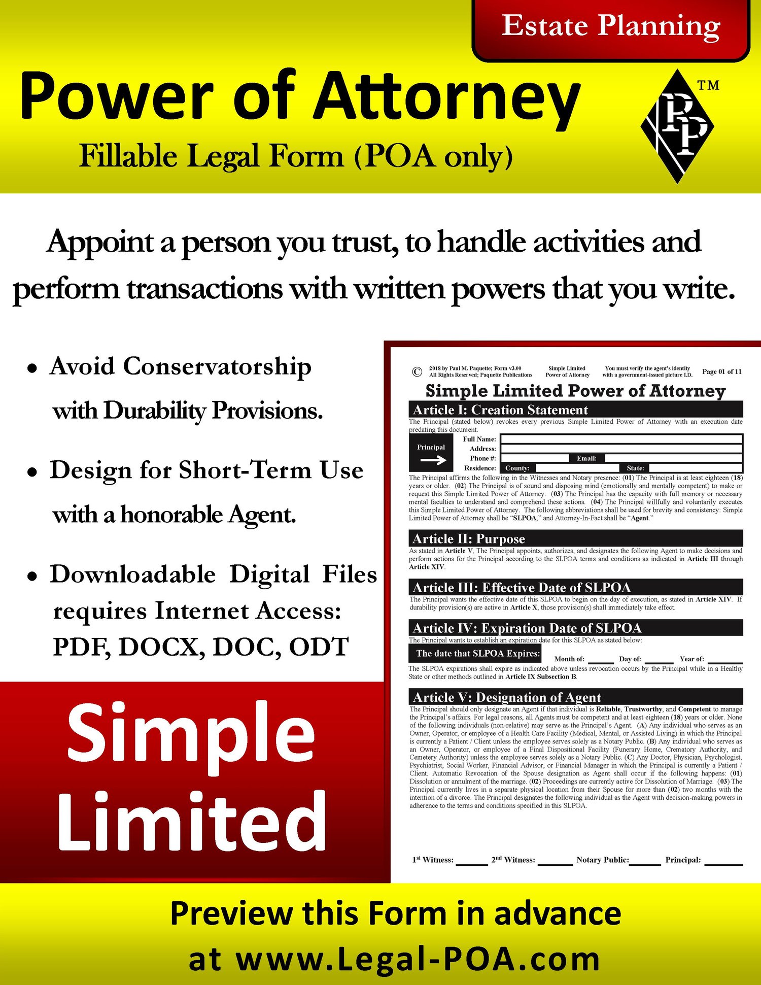 Simple Limited Power of Attorney is a legal document that allows you, the Principal, to appoint a person you trust, the Agent, with limited powers (written by the Principal) and abilities regarding the Principal’s property and affairs.