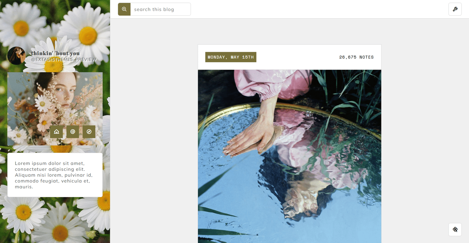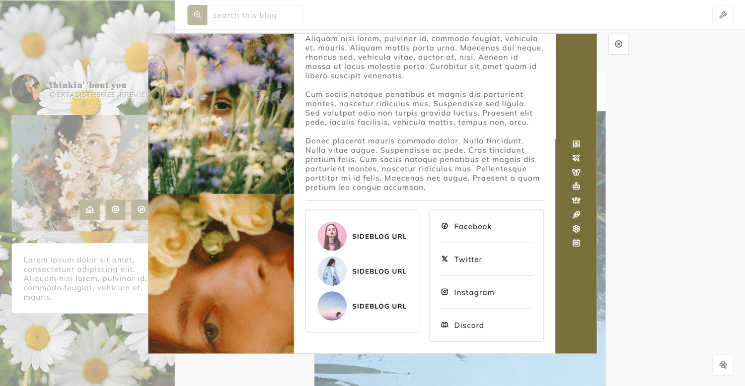 features: 300px x 100% sidebar background image, 260x200px sidebar image, 50x50px icon image, blog title, six custom links, search bar, two 250x275px about images**, about quote section**, about section**, sideblogs section**, socials section**, 450px to 540px text posts