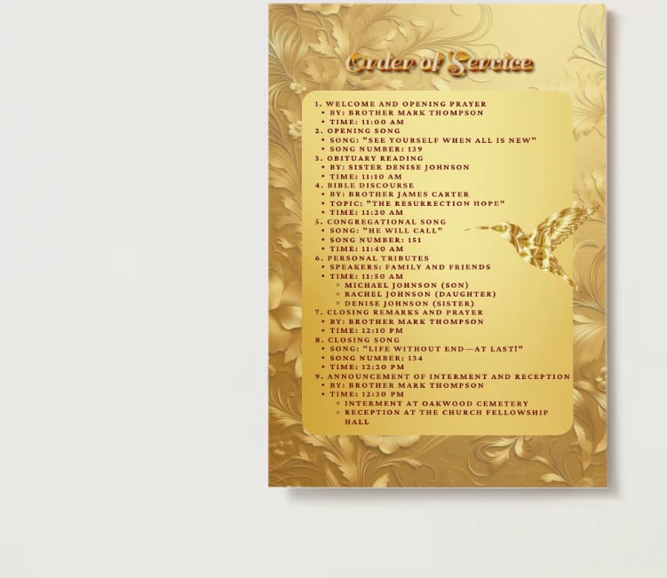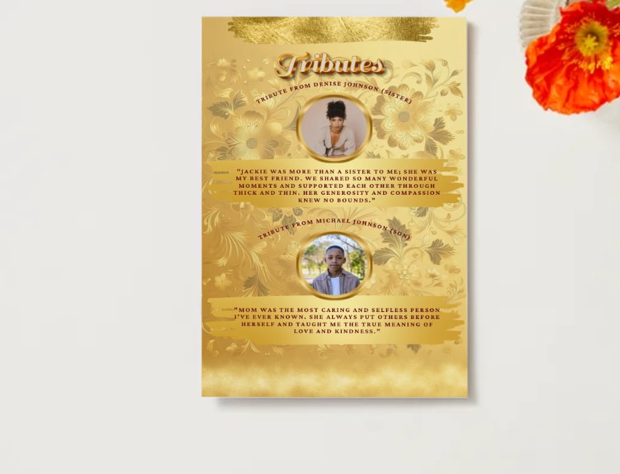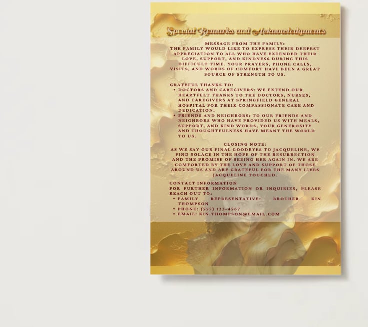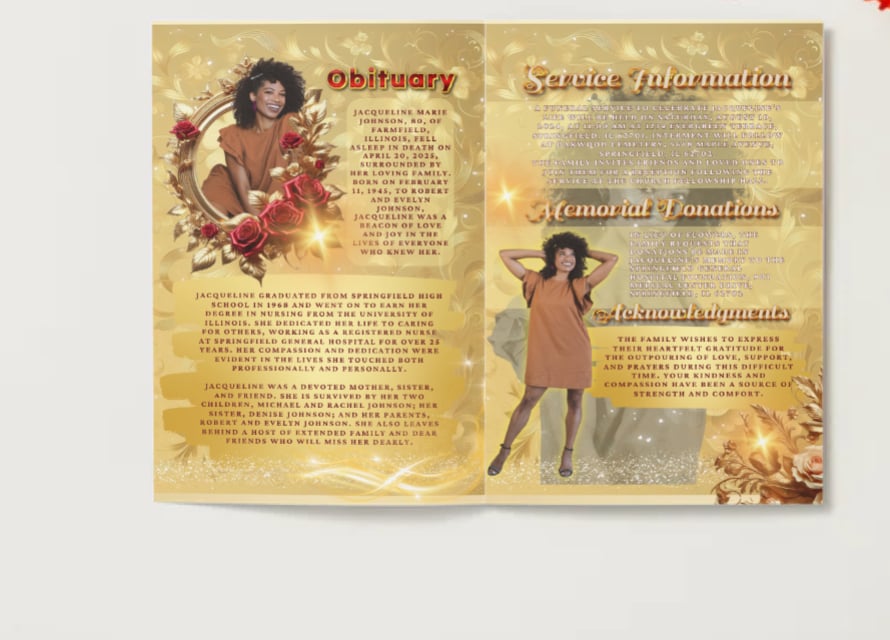 Honor your loved one’s memory with grace and sophistication. This beautifully designed gold-themed obituary template is fully editable, allowing you to personalize every detail—from photos and text to fonts and layout. Perfect for memorials, funeral programs, or celebration-of-life events, it offers a timeless look while saving you time and stress.
