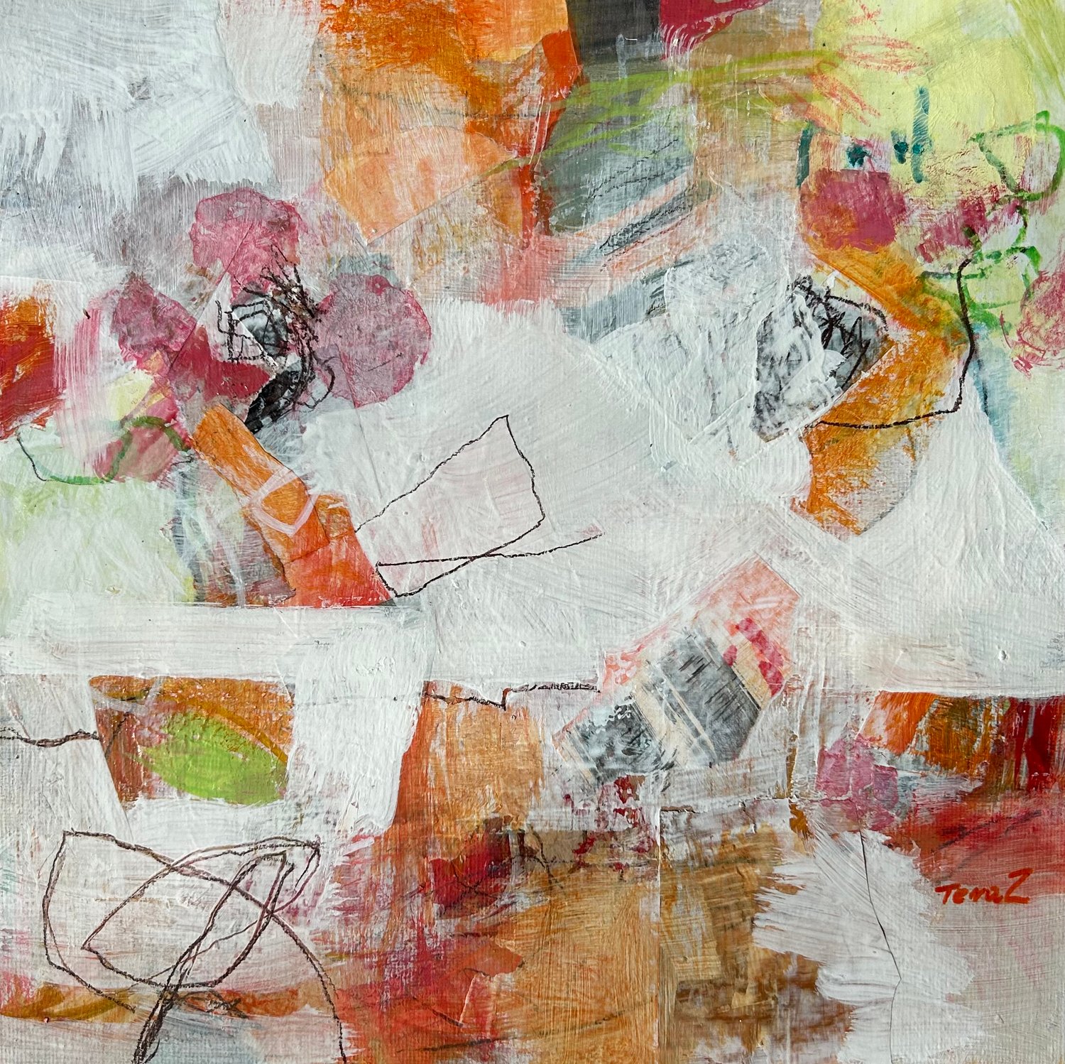 Cette composition joue avec la retenue et l’espace. Les superpositions légères, les zones effacées et les traces presque calligraphiques créent un dialogue subtil entre présence et effacement.