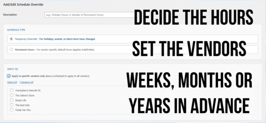 WCFM’s built-in vendor-status controls require administrators to manually update each vendor’s status individually. This means every time the market opens, closes, or adjusts its schedule someone has to go and individually make the adjustments to every vendor manually. A time-consuming process that grows increasingly cumbersome as vendor numbers increase.