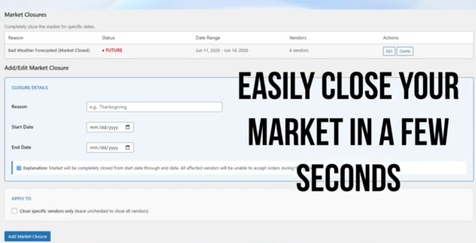 This robust solution is now available for all markets running on the WooCommerce Farmers Market (WCFM) platform, delivering a significantly more efficient way to manage vendor availability during market hours and special events.