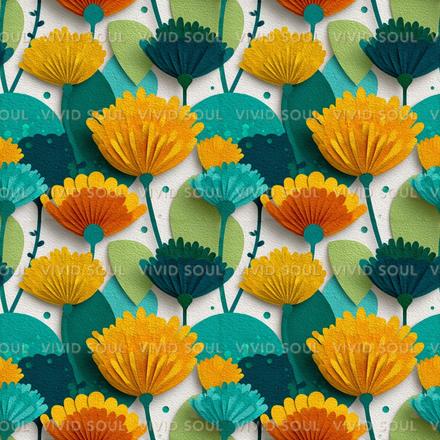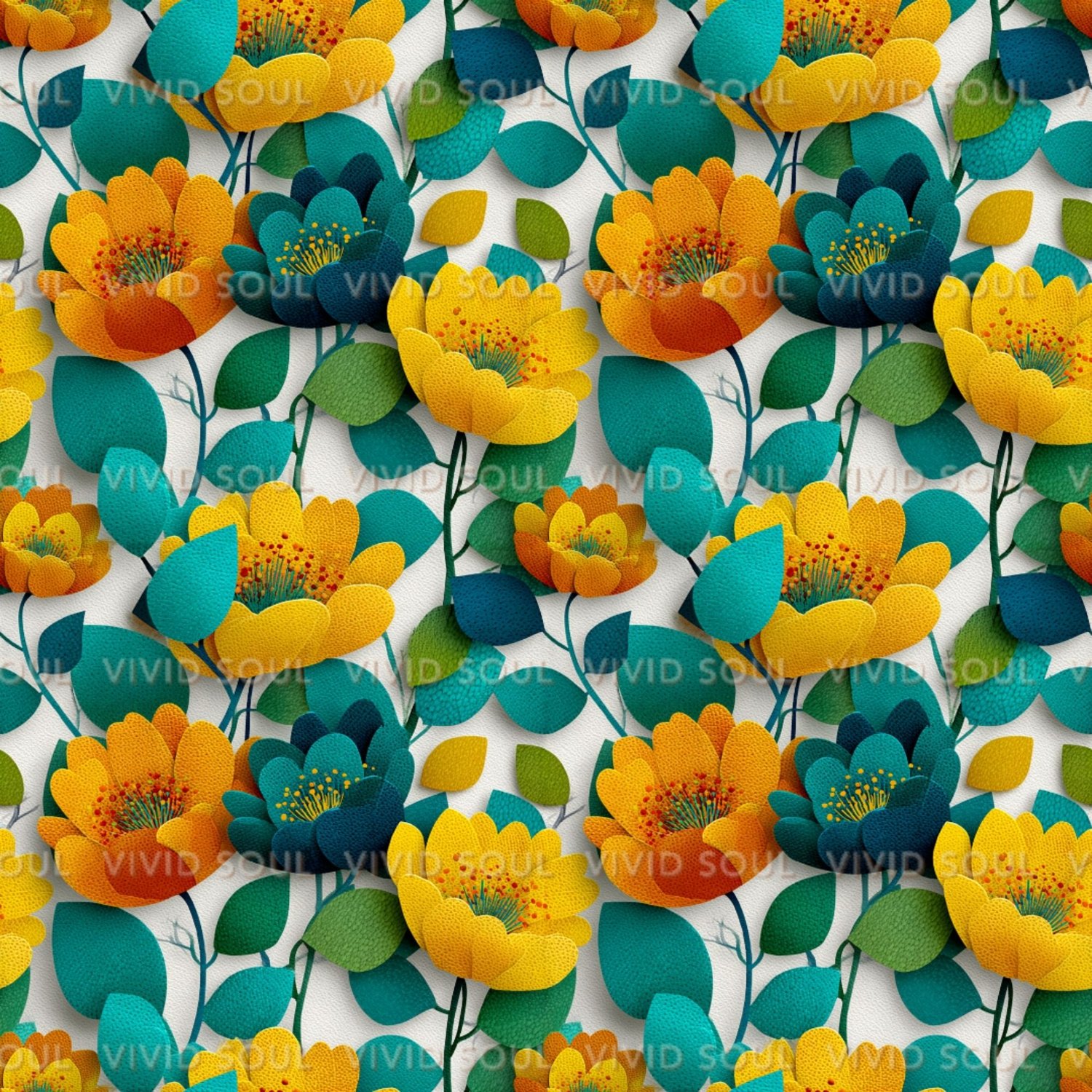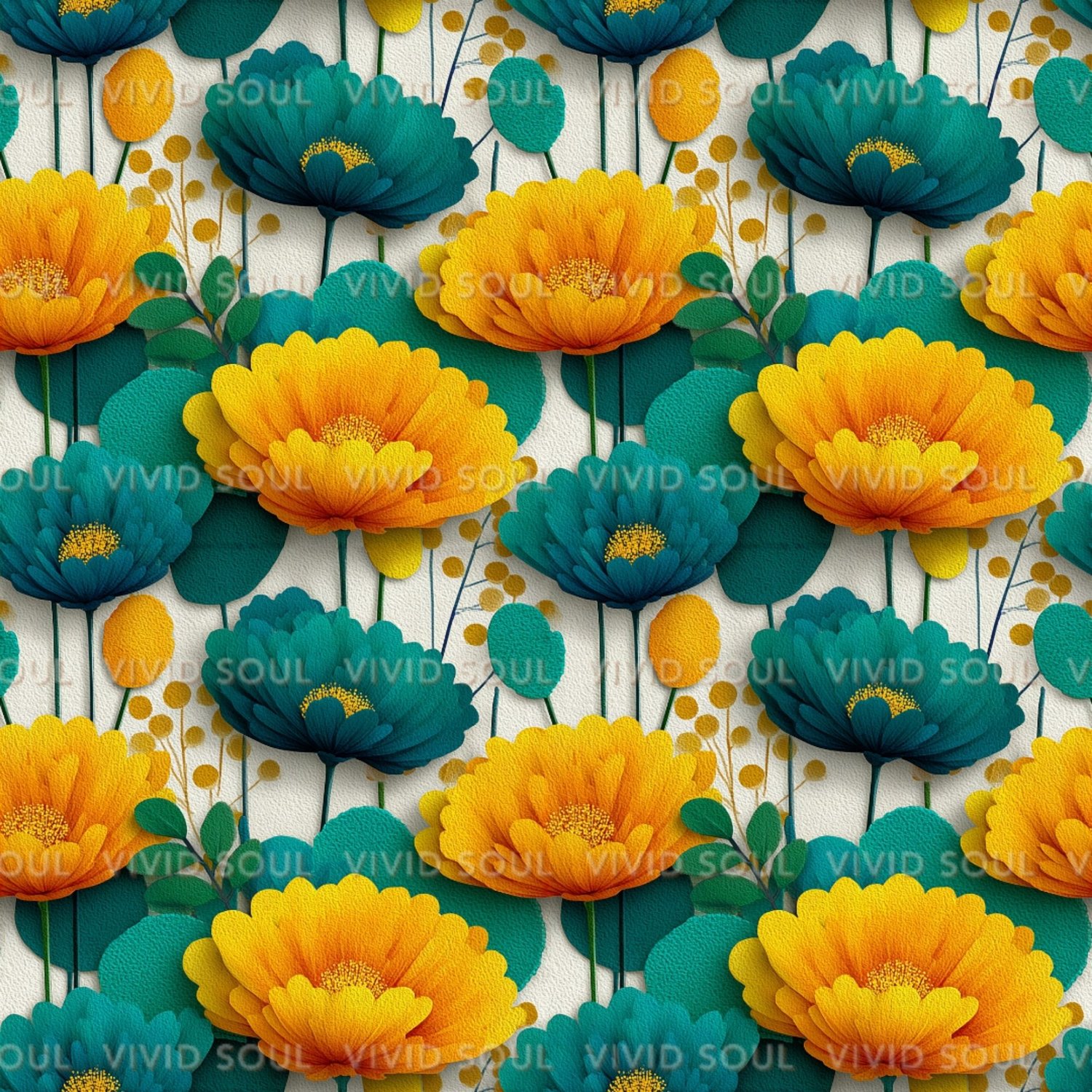 Bring bold color and texture to your creative projects with this set of 4 high-resolution digital floral patterns. Featuring retro-inspired blooms in teal, gold, and orange, these designs are perfect for fabric printing, stationery, wall art, or digital backgrounds.