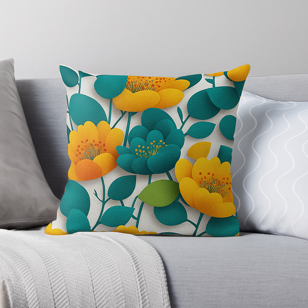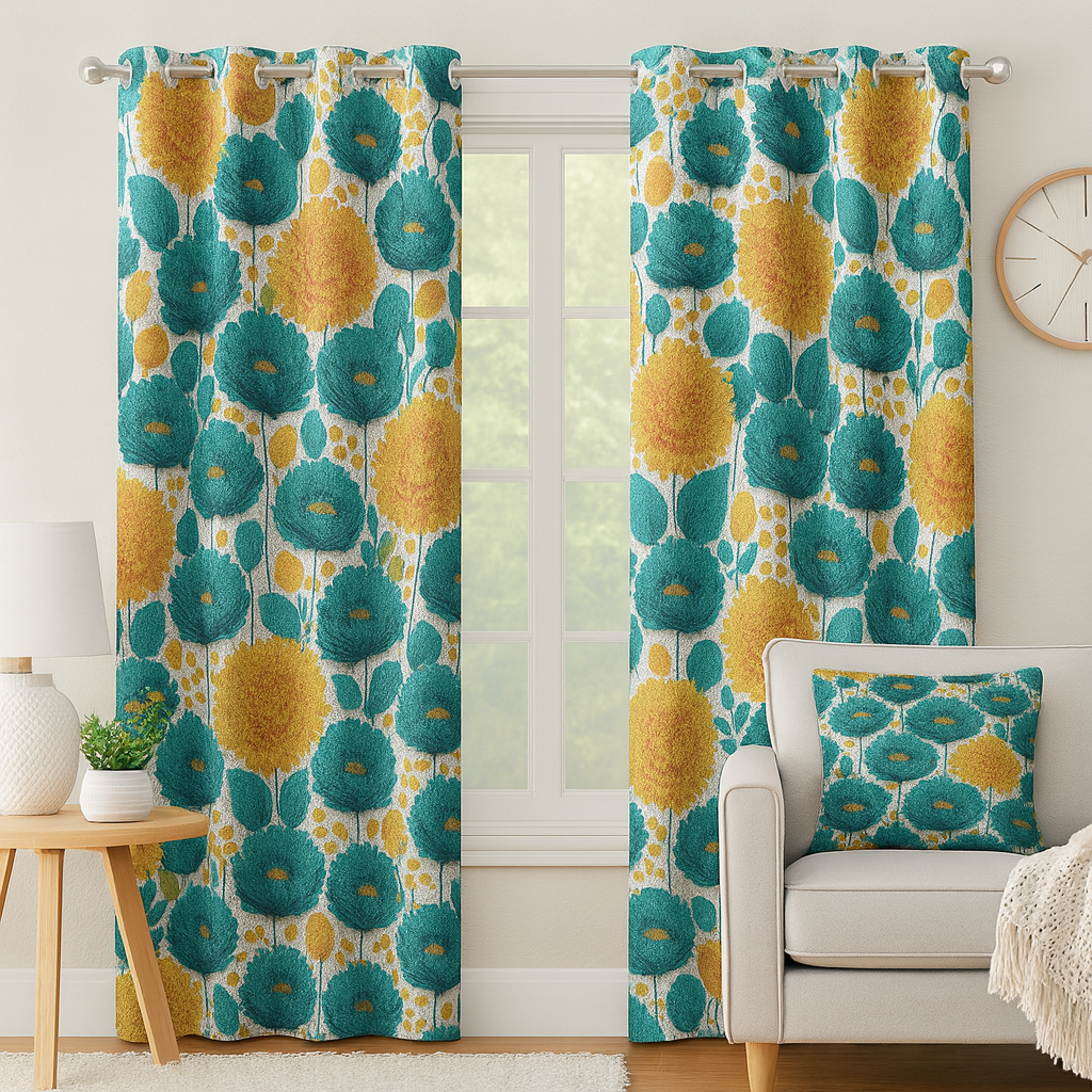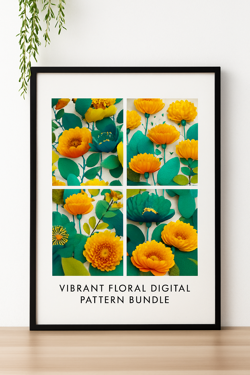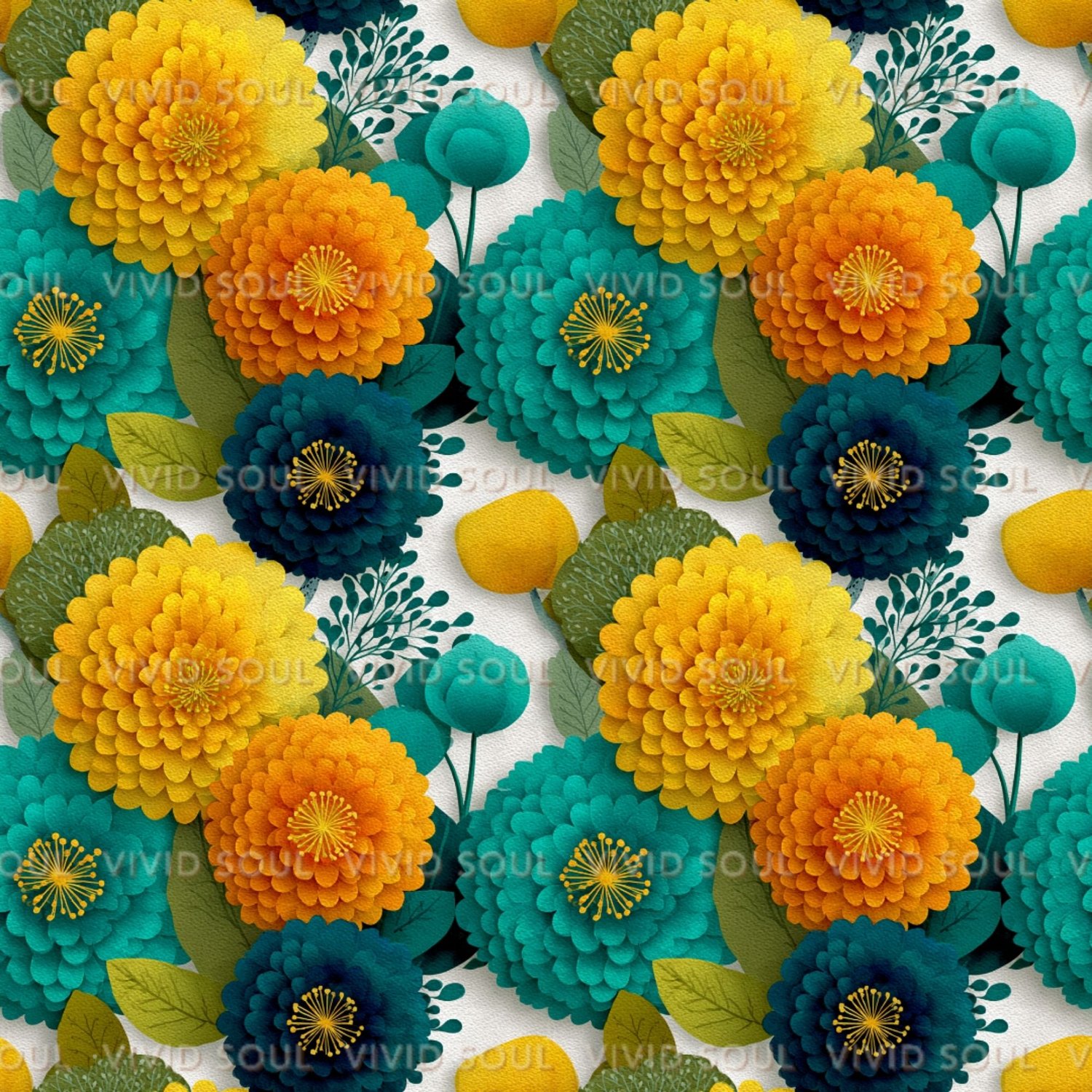 Bring bold color and texture to your creative projects with this set of 4 high-resolution digital floral patterns. Featuring retro-inspired blooms in teal, gold, and orange, these designs are perfect for fabric printing, stationery, wall art, or digital backgrounds.