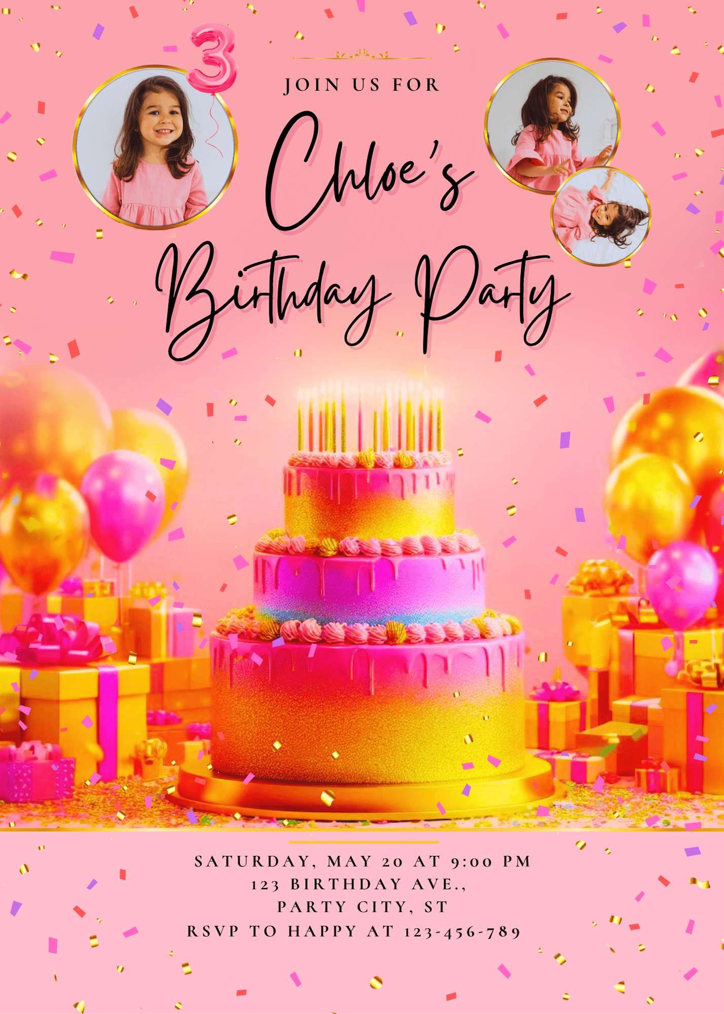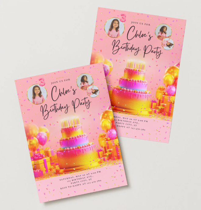 Celebrate in style with this elegant Pink & Gold birthday invitation! Perfect for girls of any age, this beautifully designed template lets you customize all the party details — right from your phone, tablet, or computer using Canva (free account works!).