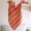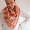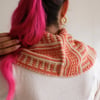 The piece is knit flat from the back neck towards the wide front section and shaped with increases. The edges are polished with built-in i-cord that is continued in the two-color i-cord bind off, video tutorial provided. Colors are carried along the edge and hidden in the i-cord edging, so there’s no yarn cutting and just a couple of ends to weave in in the end! Mosaic stitch patterns are both charted and written out.