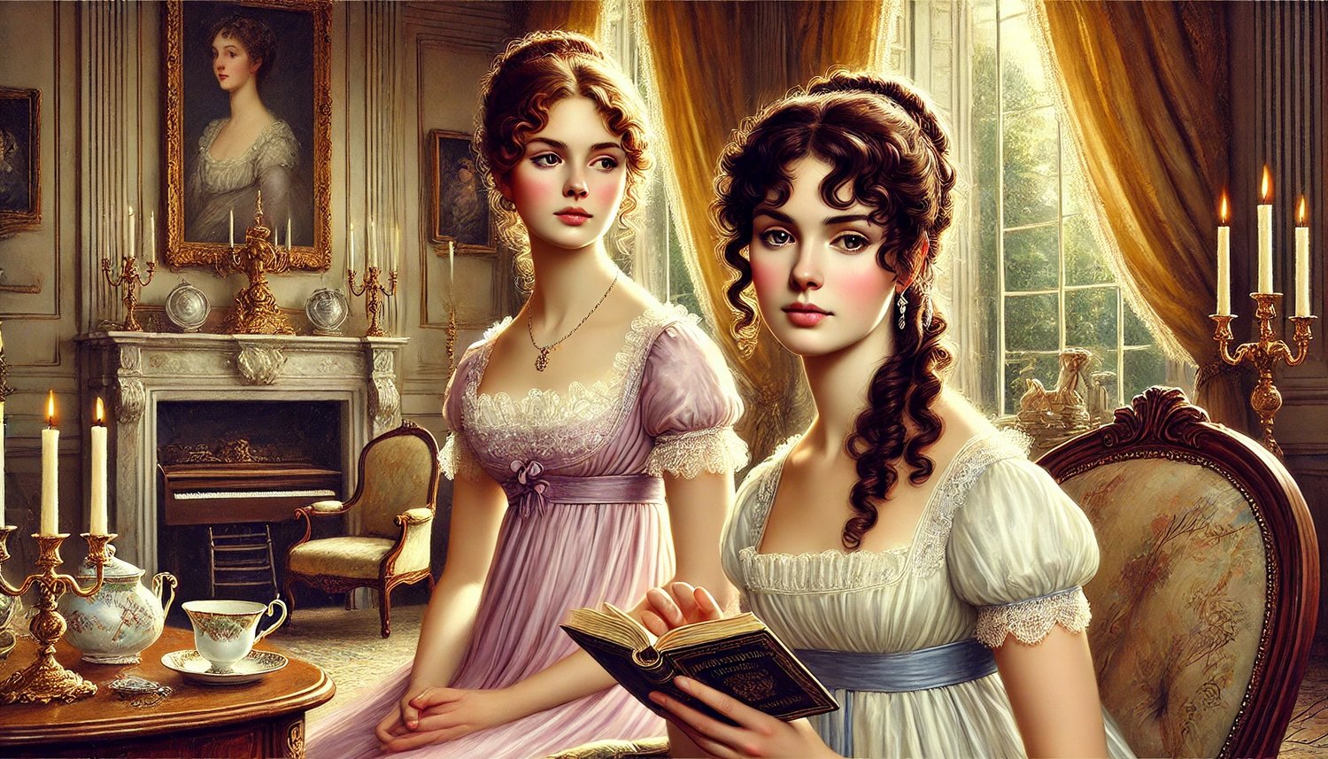 Step into the refined world of Sense and Sensibility with this exquisite digital artwork inspired by Elinor and Marianne Dashwood. This high-resolution, Regency-style illustration beautifully captures the contrast between Elinor’s composed rationality and Marianne’s passionate sensibility, set in an opulent Georgian-era drawing room.