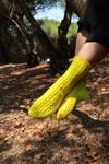 These socks are inspired by the traditional lace socks from the north of Portugal. The most traditional ones are knitted with natural-colored and hand-spun wool. For my version, I picked a very vibrant color that highlights the lace pattern. As they were traditionally worn with clogs, the embroidery extends over the heel flap, down to the heel turn. The socks are knitted from the top down and with the wrong side facing, purling all rounds (Portuguese style). The socks feature a classic heel with lace along the heel flap and a gusset with decreases. The toe has a round shape, like the traditional socks here in Portugal. The instructions are written for working with double-pointed needles but include notes on how to adapt for magic-loop knitting.