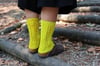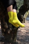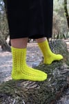 Estas meias são inspiradas nas tradicionais meias rendadas do Norte de Portugal. As mais tradicionais são tricotadas com lã de cor natural e fiada à mão. Para a minha versão escolhi uma cor bem vibrante que realça os rendados. Como tradicionalmente se usavam com socos, o bordado estende-se também pela aba do calcanhar, até à viragem do mesmo. Estas meias são tricotadas de cima para baixo, ou seja, do cano para a biqueira e pelo lado do avesso, sempre em liga. As meias são decoradas com um ponto rendado em toda a perna e ao longo do peito do pé. O calcanhar é tradicional, com uma aba em ponto rendado e uma cunha com diminuições. A biqueira é redonda, como as meias mais tradicionais aqui em Portugal. As instruções estão escritas para tricotar com 5 agulhas de meia, mas inclui notas para adaptar e tricotar em magic-loop.