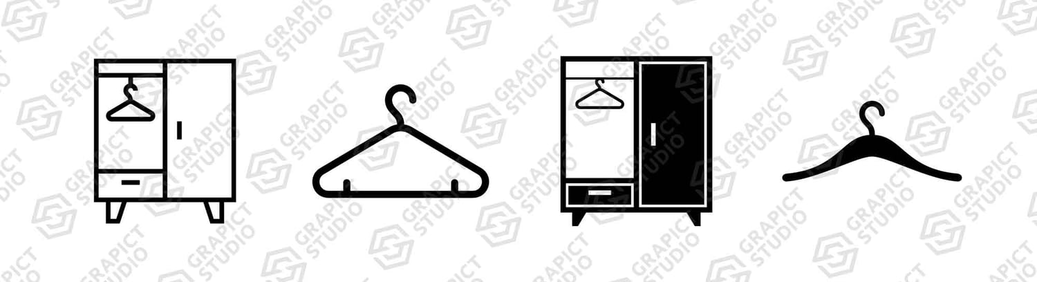 Wardrobe icon set of 4, design element suitable for websites, print design or app. Outline and flat style clothing wardrobe related to boutique and clothing organizer.