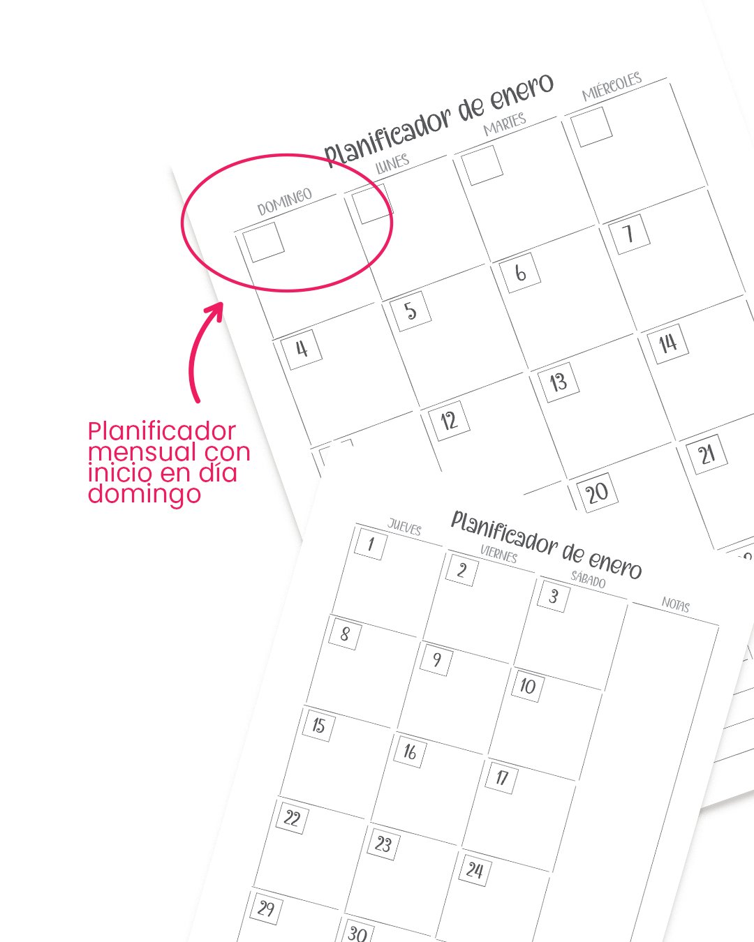 Planificador mensual (2 páginas) con inicio semana en DOMINGO