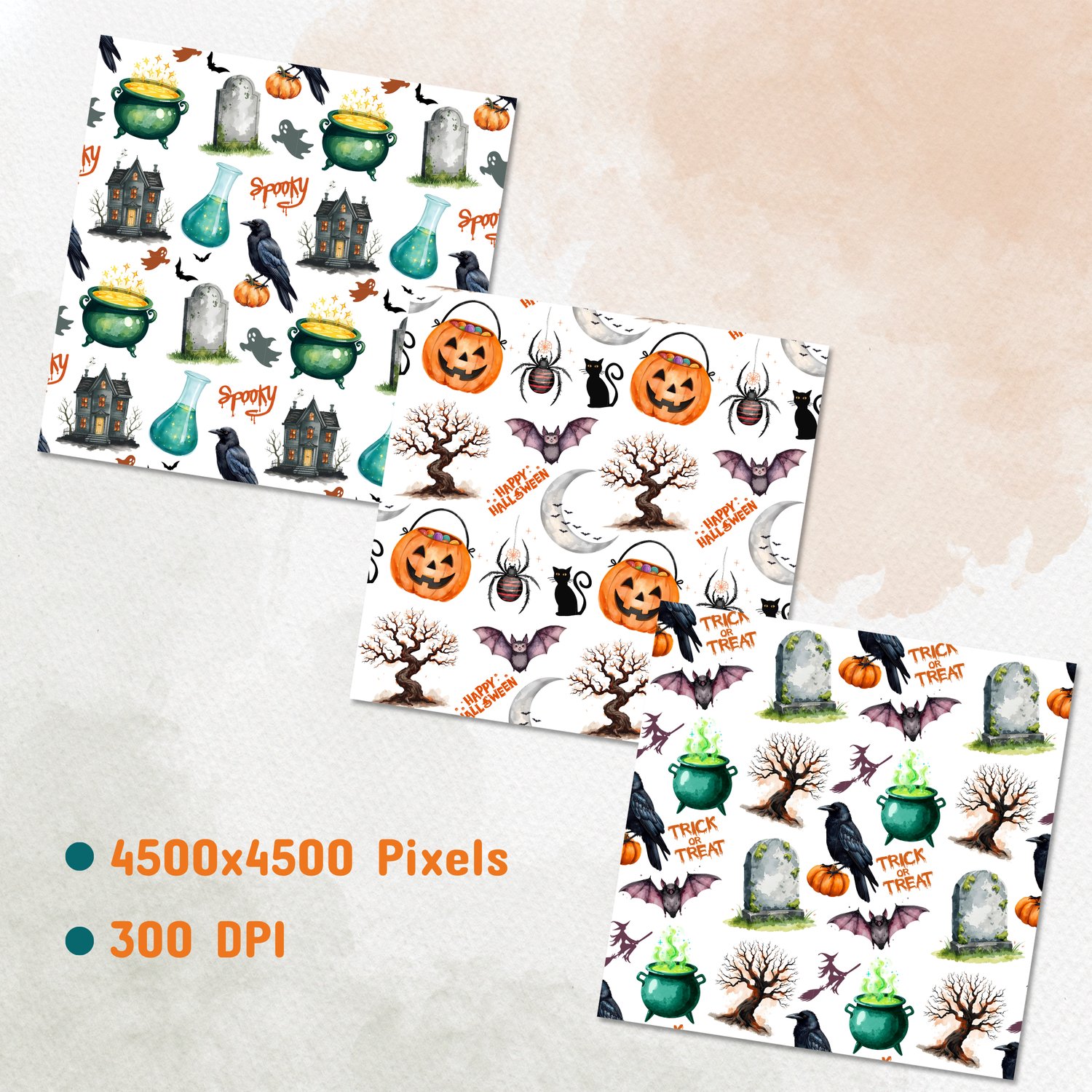 Celebrate the spooky season with this set of 10 Halloween watercolor seamless patterns. Each digital pattern features beautifully illustrated elements such as spooky haunted houses, flying bats,bubbling cauldrons, black cats, spooky trees, potion bottles, black ravens, spiders and more. Designed in a cohesive watercolor style, these seamless patterns combine vibrant colors and detailed artwork to create a high-quality, ready-to-use collection for all your Halloween-themed creative ideas.