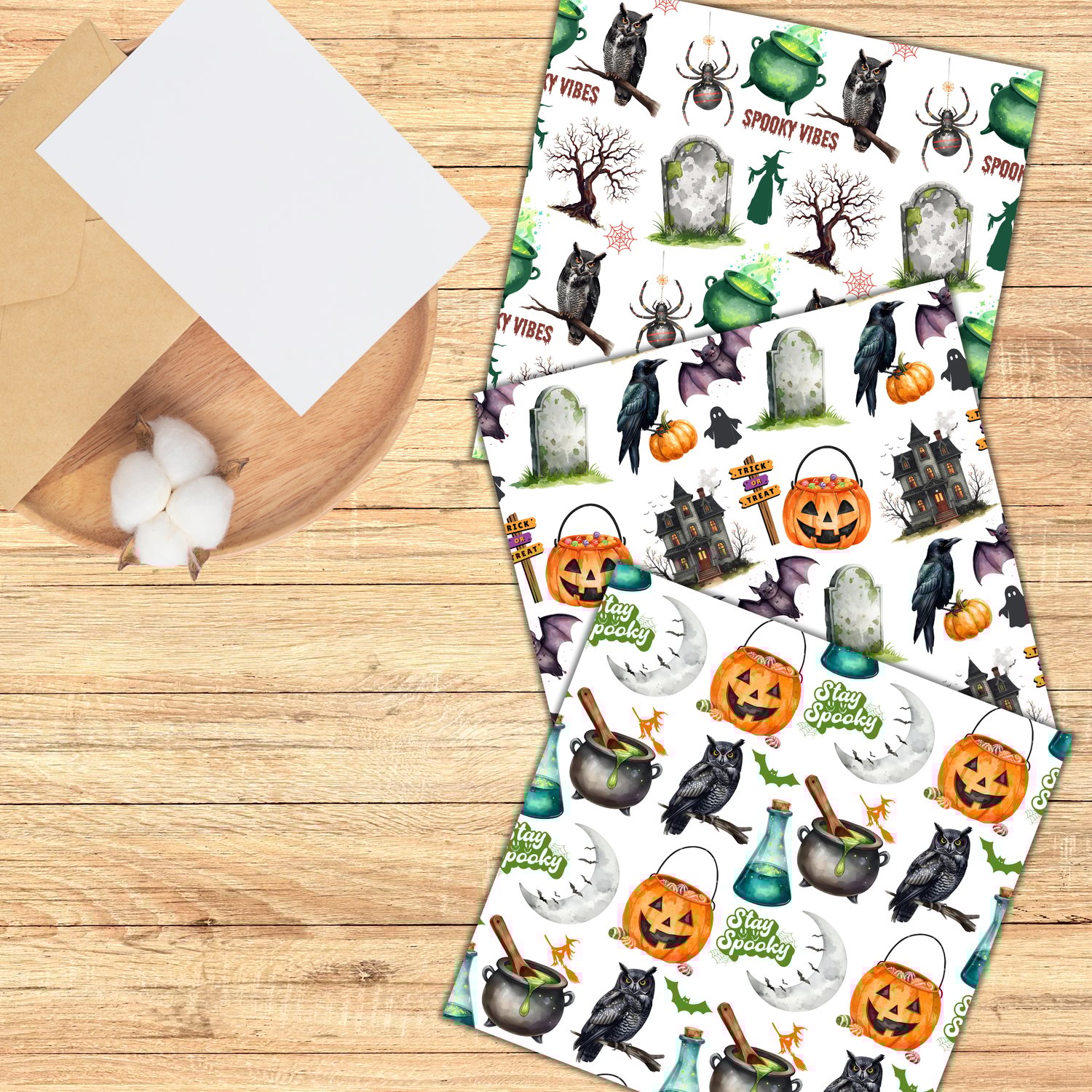 Creating Halloween-themed invitations, party printables, greeting cards, gift wrap, treat bags, planner stickers, scrapbooking pages, social media graphics, product packaging, and seasonal fabric designs. The seamless format makes it easy to apply these patterns to both digital and printed projects.