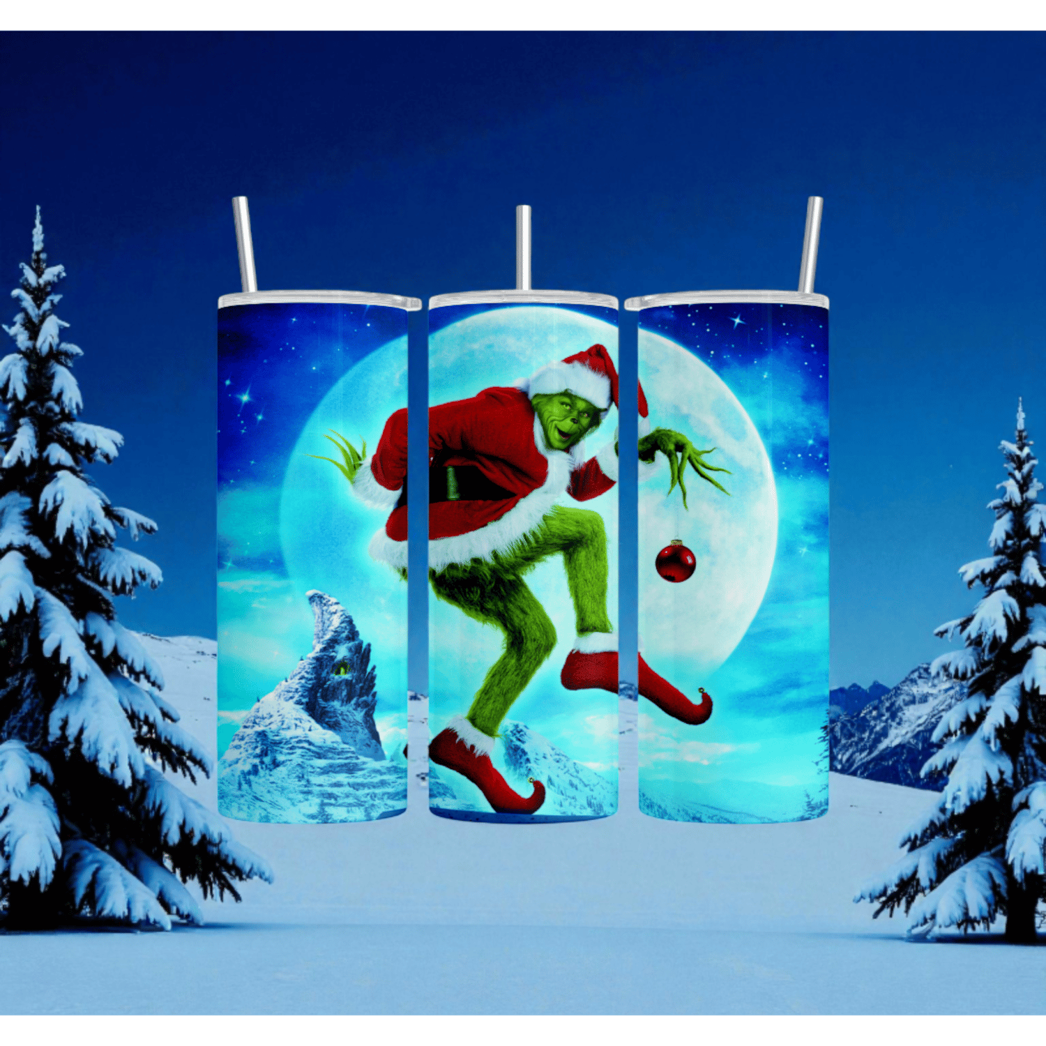 Steal the spotlight this season with our 20oz insulated skinny tumbler featuring the mischievous Grinch in full holiday flair! Wrapped in a dynamic moonlit scene with snowy mountains and twinkling stars, this tumbler captures the perfect blend of whimsy and winter wonder.