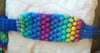 Festival Muff handwarmer, flexible and stretchy pattern stitch suited to yarns with long colour changes. Uses only one colour at a time, no stranding. Very easy technique and a great stash buster, use a self striping yarn or go for rows of different colours. Muff features a ribbed cuff to keep it in place and a 3d textural pattern. Knitted cuff through body to the other cuff.