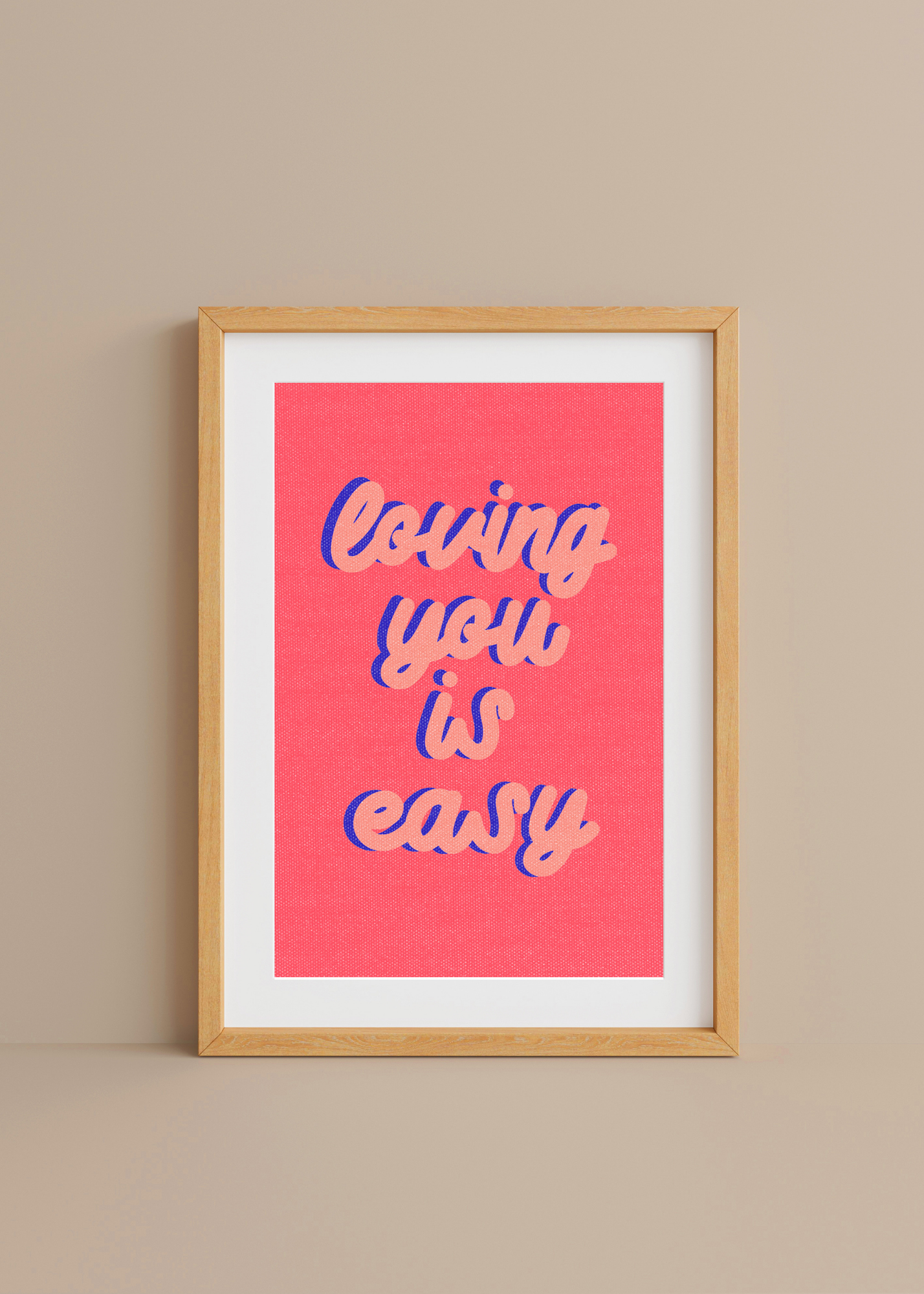 Loving You Is Easy— A mellow pink background and soft bubble cursive lettering in blush and lilac. This gentle, romantic print whispers softness and ease. The kind of love you fall into and never want to leave.