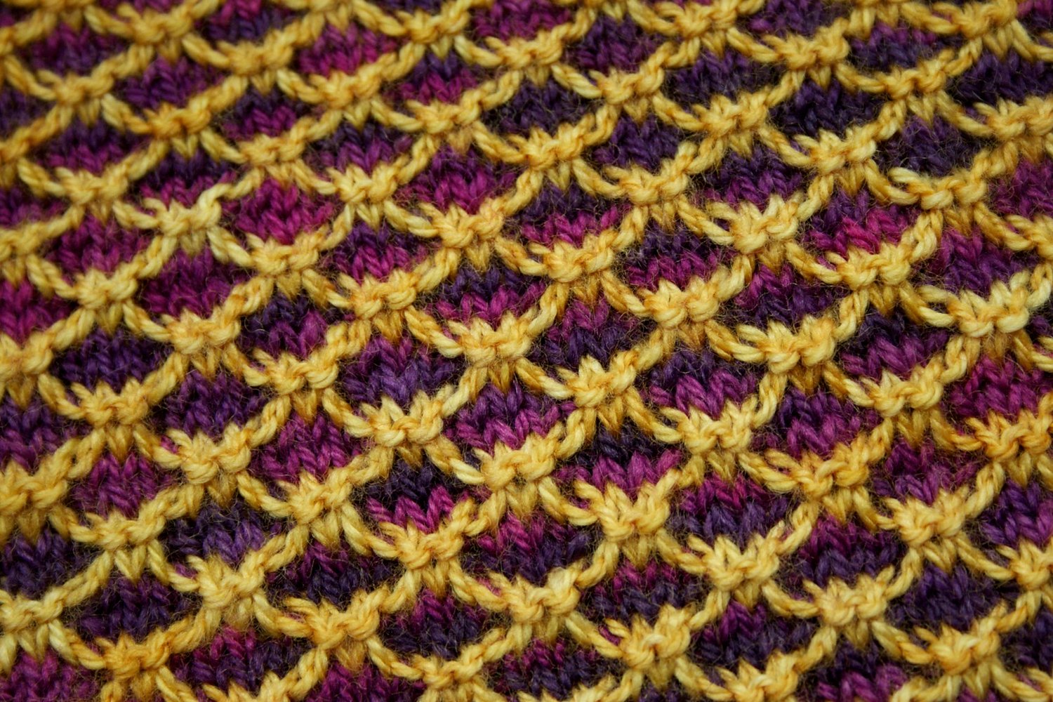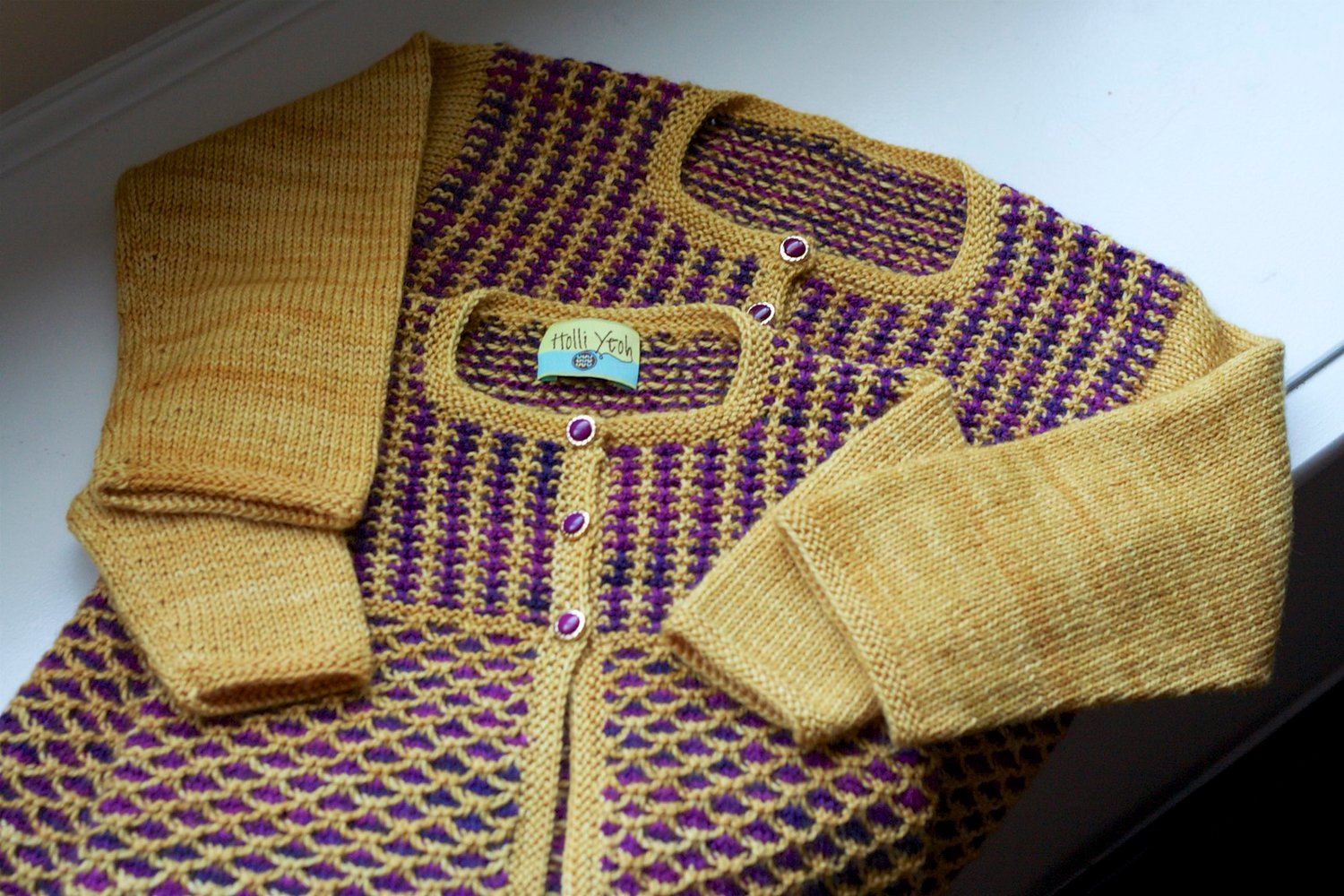 Colorwork using slip-stitch patterns feels a little bit like cheating, but I love the effect it achieved here. Felicia of SweetGeorgia Yarns helped choose the colorway and I absolutely adore it. The surprise is that the gold and amethyst colors paired with the detailed-yet-simple stitch patterns evoke the bygone era of rich brocade fabrics worn by upper nobility in medieval times.