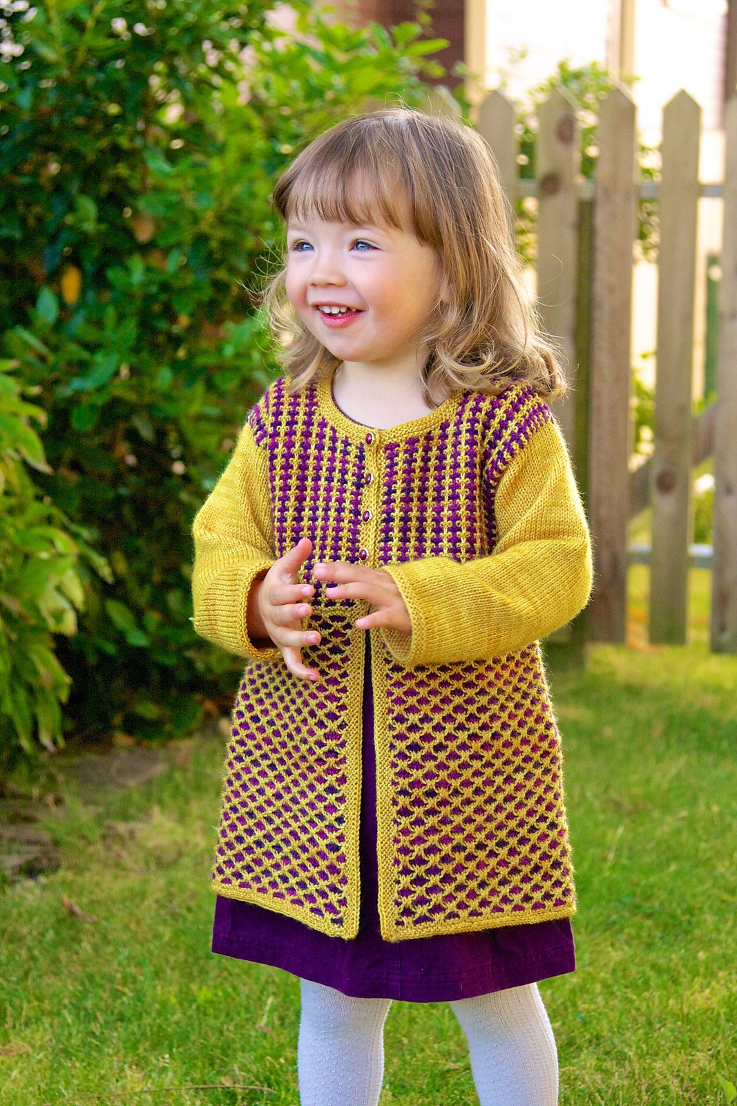 This design is started at the lower edge of the bodice with a provisional cast on. After the bodice is worked, the live sts are retrieved and the body of the cardigan is worked top down. Shaping is achieved by gradually changing needle size when working the body.