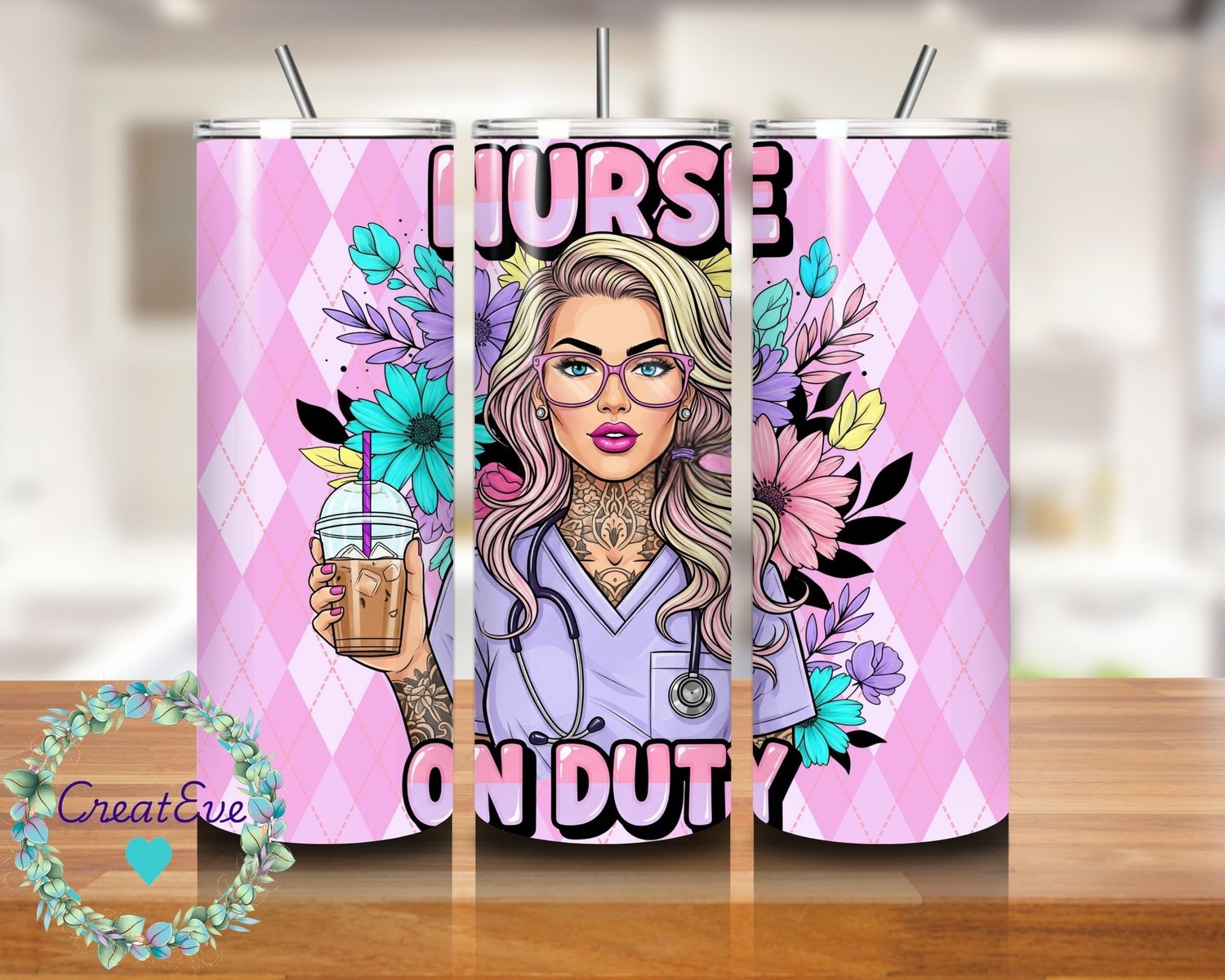 Preppy Tattooed Nurse Pastel Diamond Seamless 20oz Skinny Tumbler Wrap PNG