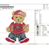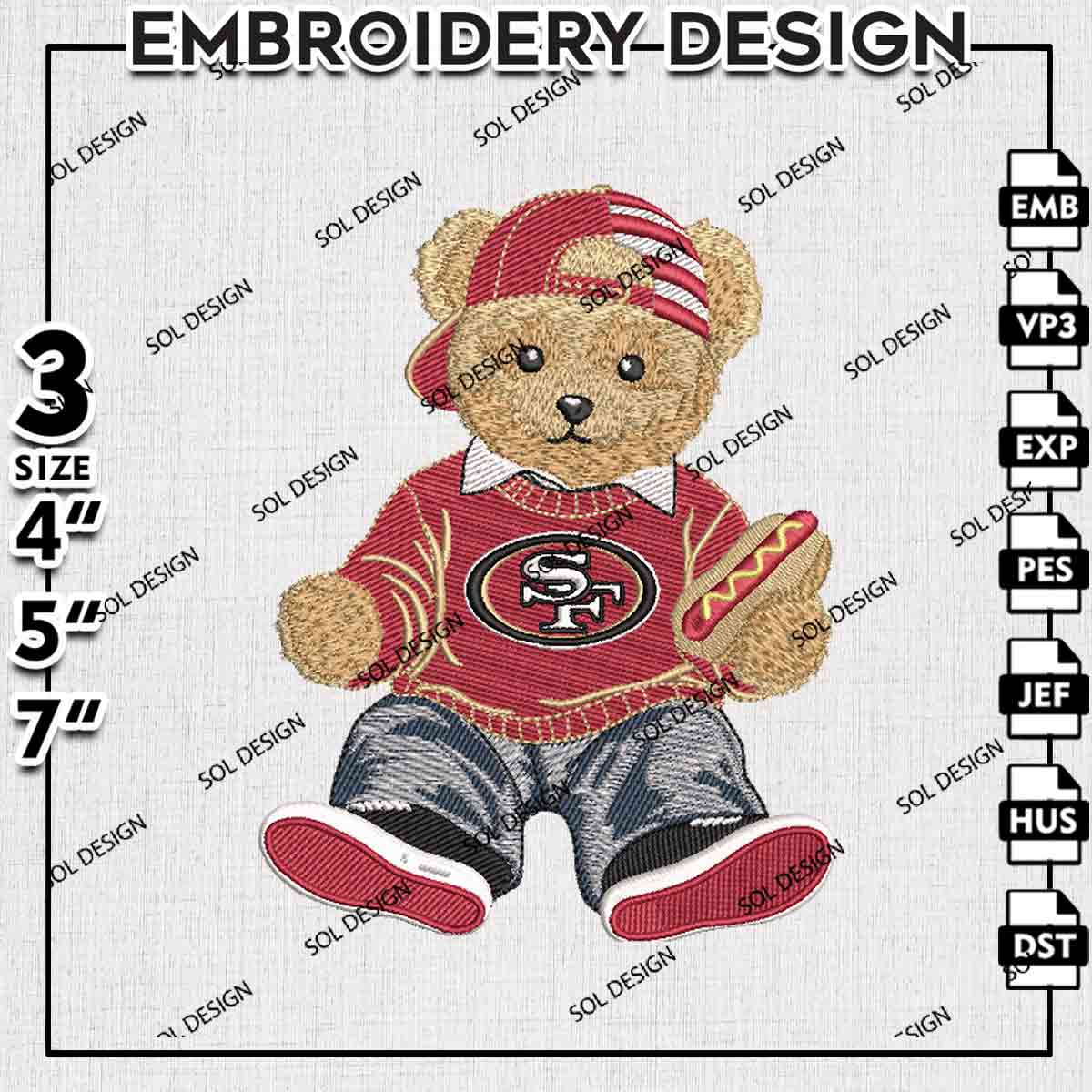 San Francisco 49ers Team Teddy Bear Holding Hotdog Logo Embroidery Designs, NFL San Francisco 49ers Embroidery Files, NFL 49ers Logo Embroidery, National Football League Machine Embroidery Design, Cute Teddy Bear Sport Designs, Digital Do