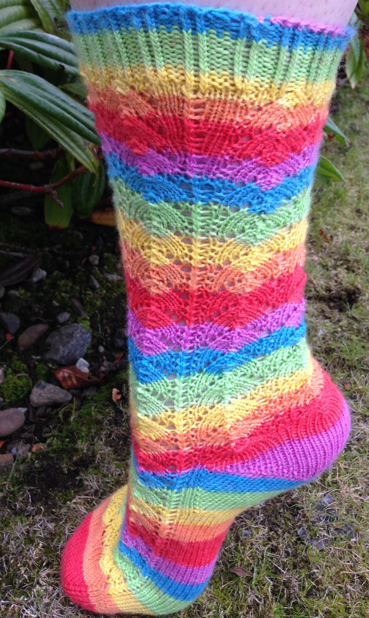 It seems that of late, so many of my fellow knitters are knitting up socks in a rainbow colorway. I got caught up in the rainbow loveliness and had to get some yarn of my own that would stripe up like a rainbow. As I debated what pattern to use to knit my rainbow socks, I decided that I needed a truly rainbow inspired stitch pattern to do the yarn justice. Thus, this pattern for Catch the Rainbow Socks was born. In all honesty, after seeing my test knitters’ finished projects, the truth is this pattern looks amazing with pretty much any self striping yarn. So grab a skein of self striping (Rainbow if you can) sock yarn and let’s see if we can Catch the Rainbow!!