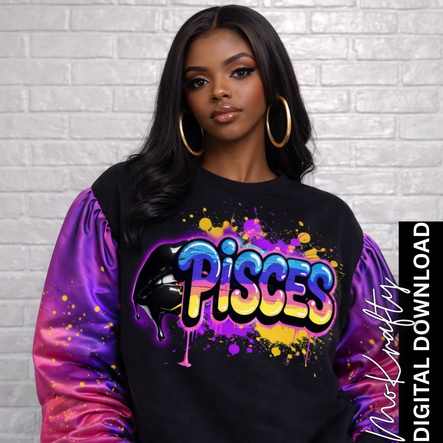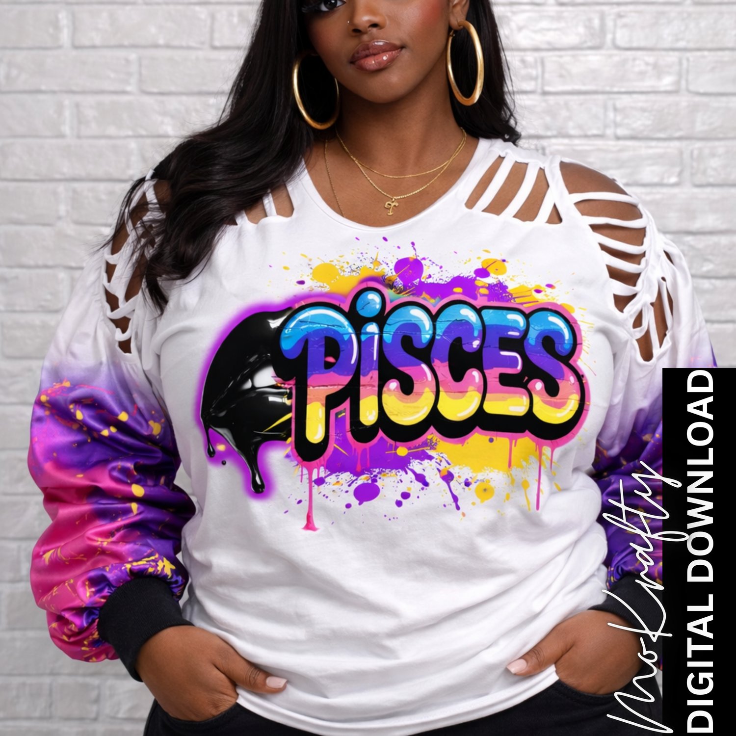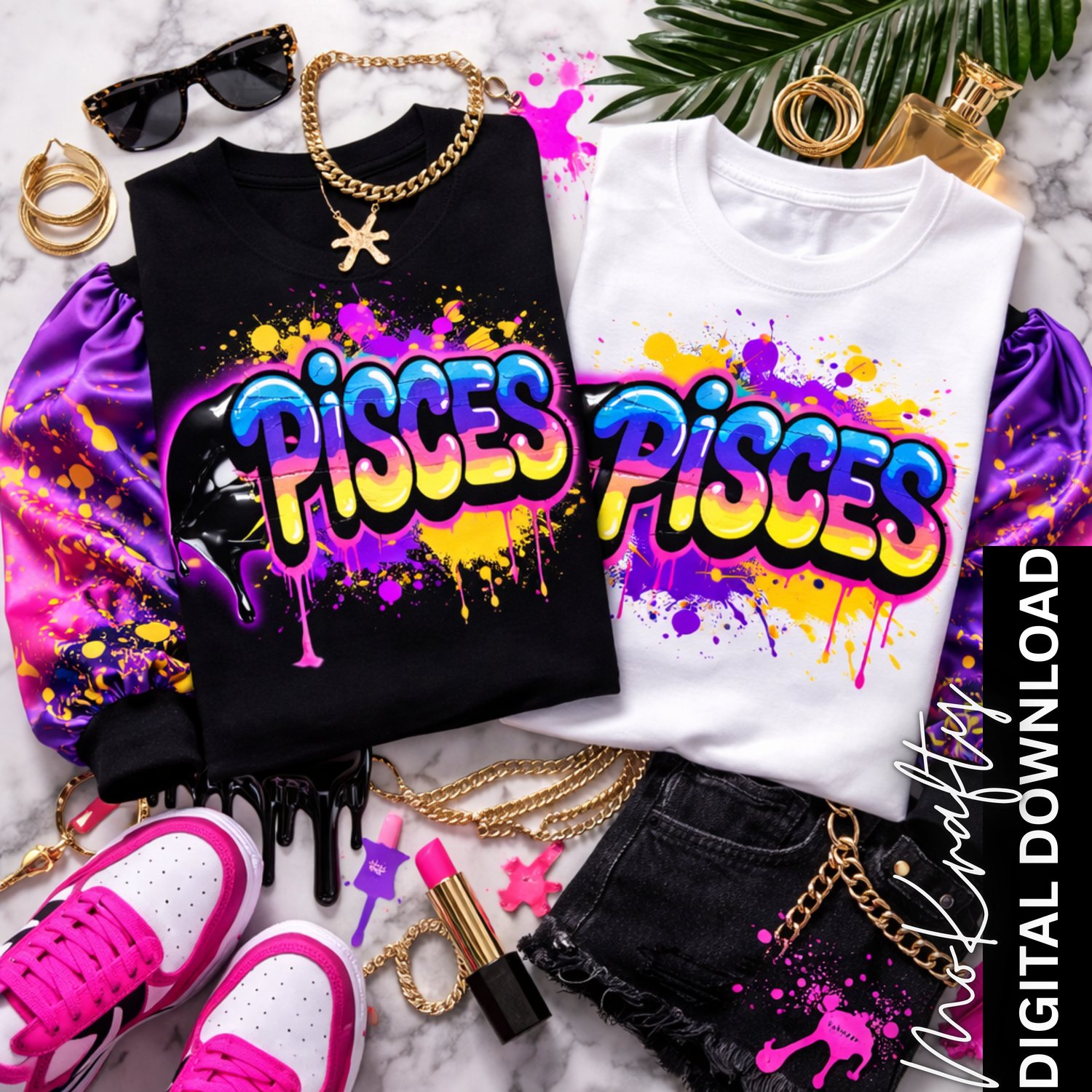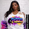 This graffiti-inspired Pisces PNG features vibrant bubble lettering, paint splashes, glossy black drip details, and bold neon-style colors. Designed for sublimation and DTF printing, this high-resolution transparent PNG is perfect for creating trendy zodiac streetwear and birthday apparel.