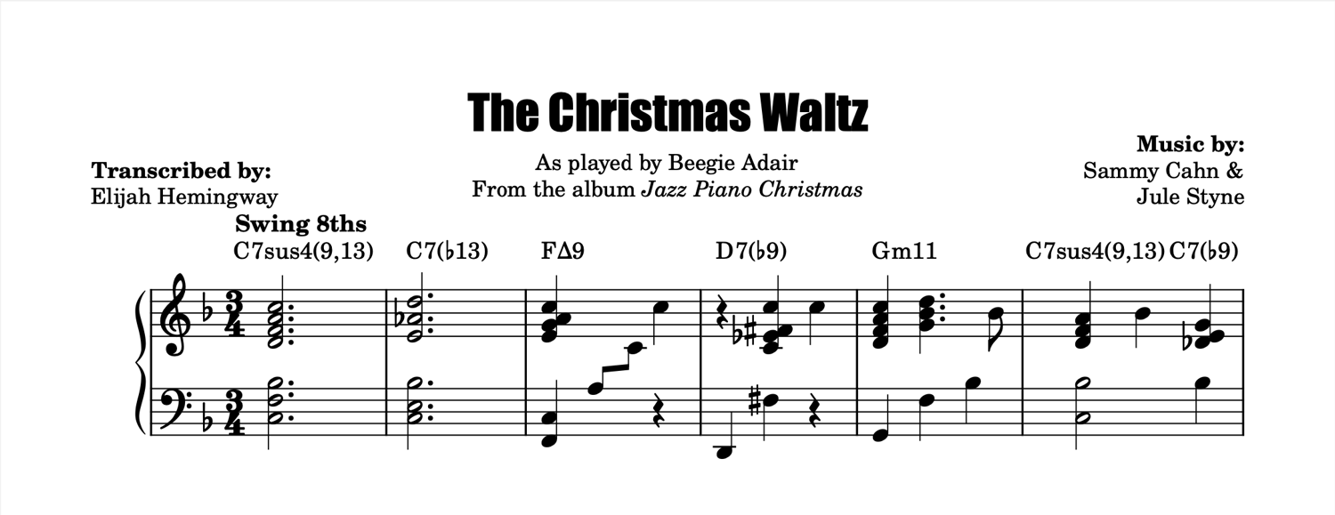 A transcription of The Christmas Waltz as played by Beegie Adair.