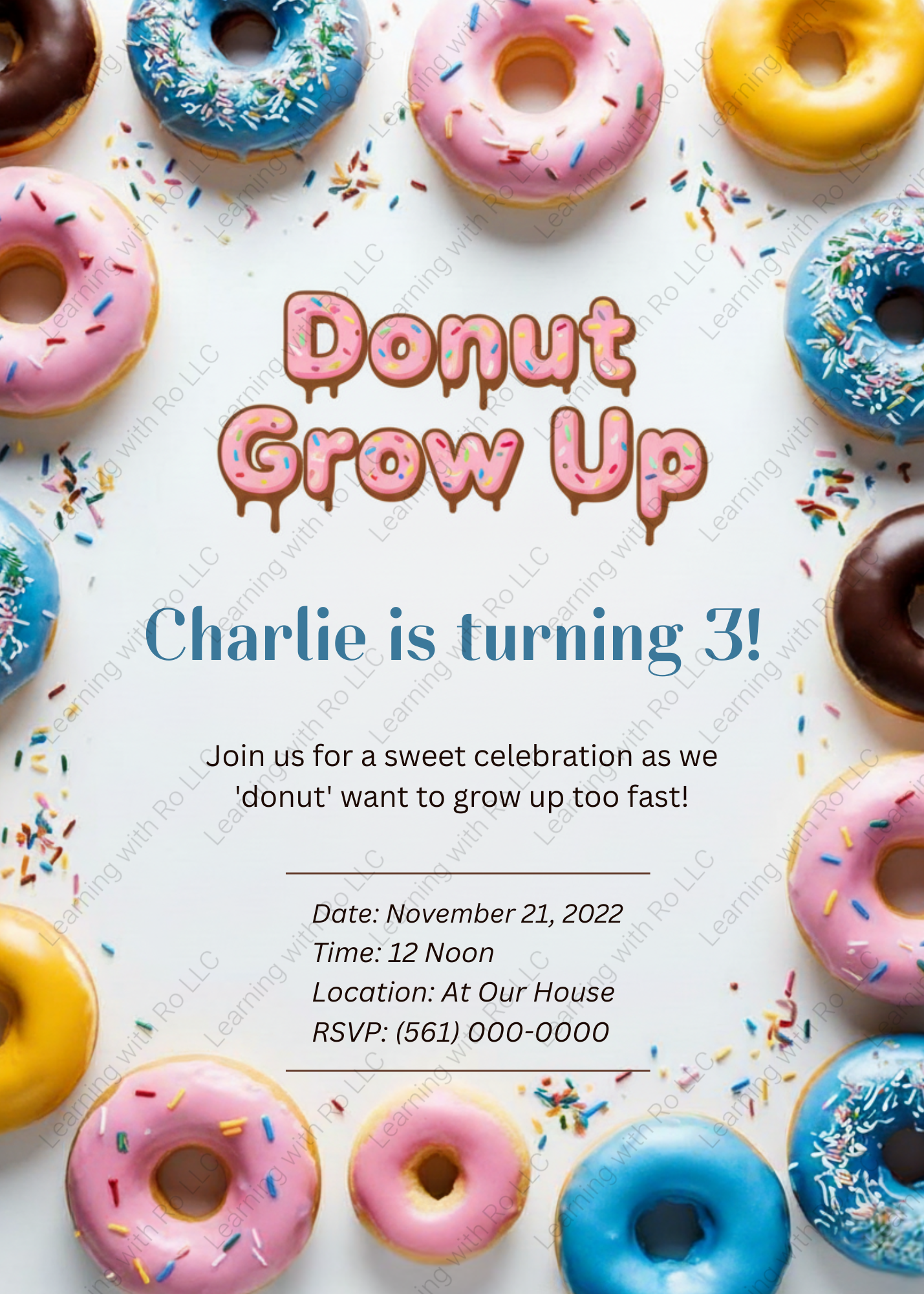 "Donut Grow Up" Birthday Invitation Template: Editable Canva Design (5x7 inches) (Digital Download)