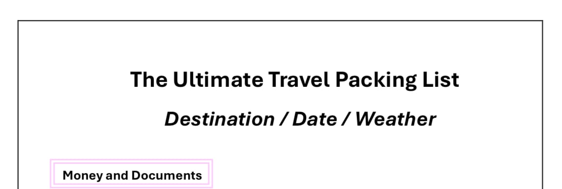 A simple 2-page travel packing list to help you stay organized before your trip. Includes essentials such as documents, clothing, toiletries, first aid items and travel basics. Easy to use, printable and perfect for vacation planning.