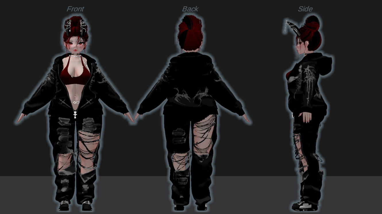 Jacket/Bra n undies, Jeans, Leggings, Shorts (By boo.vr but discontinued), Shoes/Crocs, FireTop, Sweater, Tanktop.