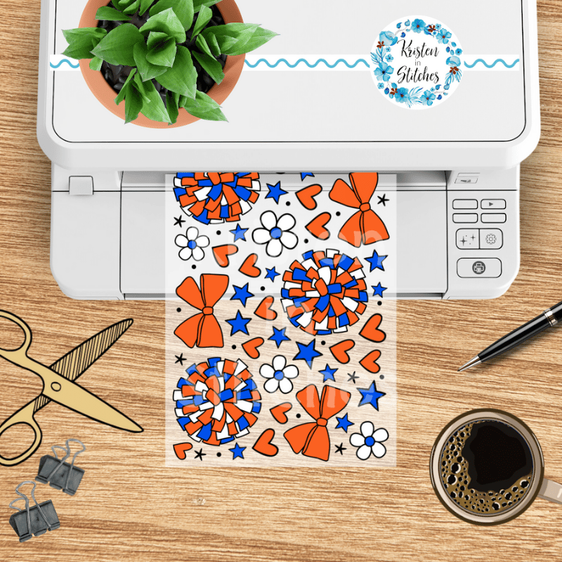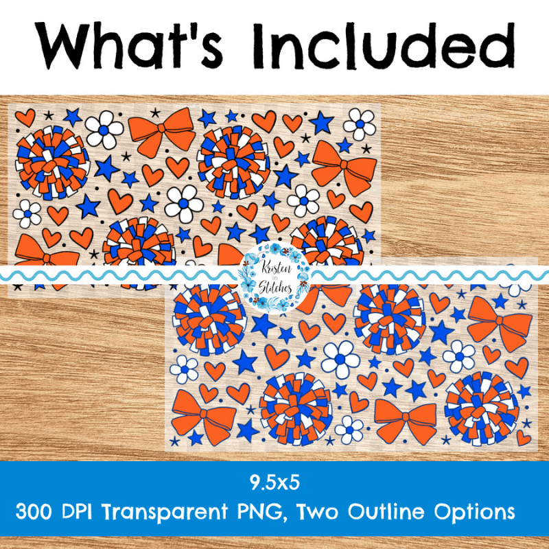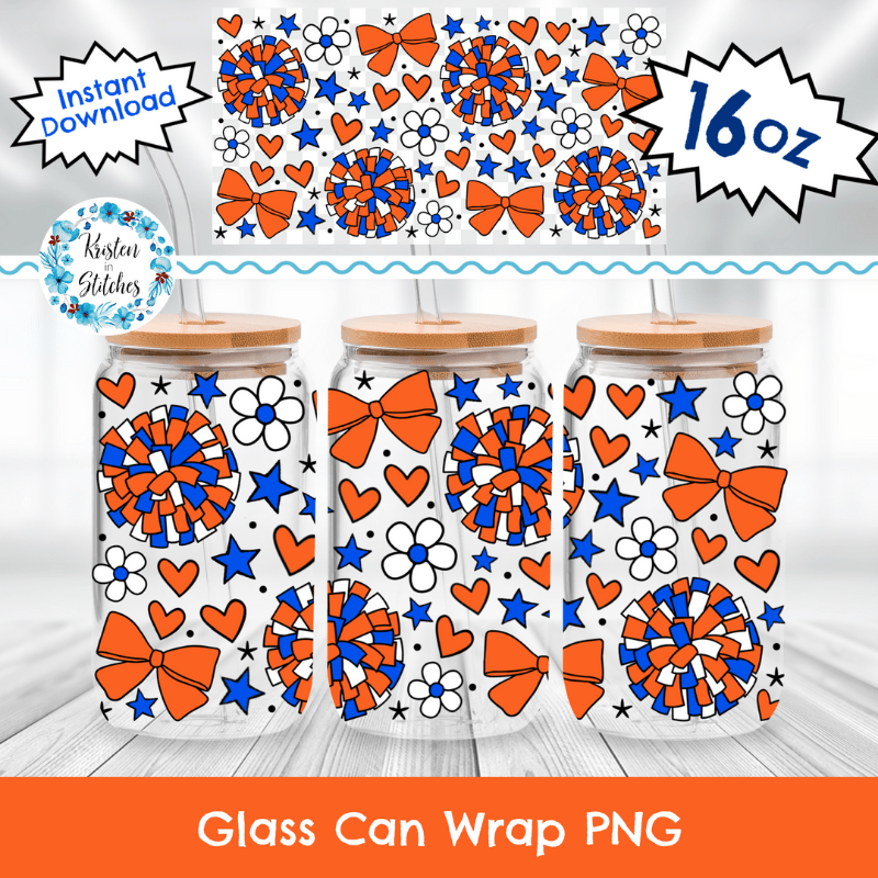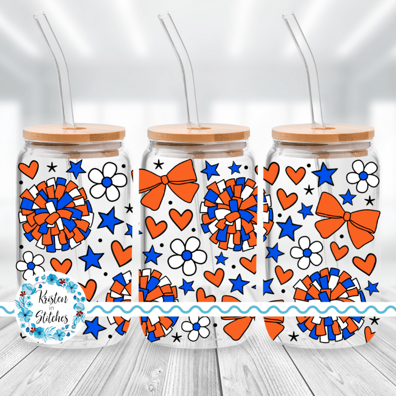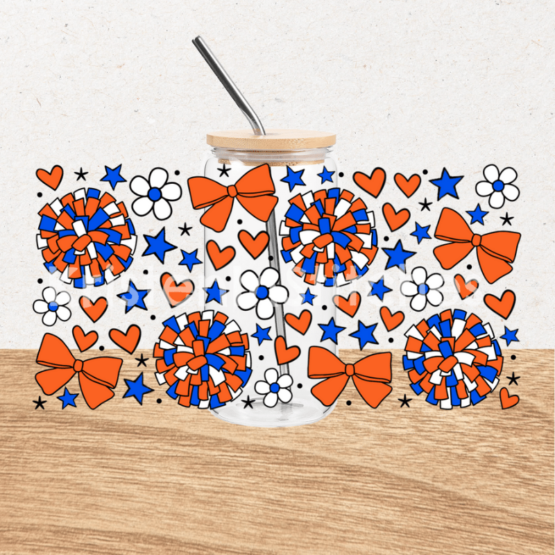Cheerleader 16 oz Glass Can Wrap Transparent PNG, Cheer Bows Pom Poms Blue and Orange