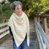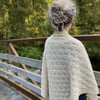 The cream shawl showing the reverse side of the knitted fabric is knit up in Harrisville Designs Shear: Merino-Dorset DK