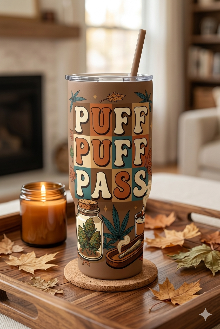 🍂 Puff Puff Pass — Cozy fall aesthetic with warm mocha and teal checkerboard lettering. Features a cork-top mason jar overflowing with buds, a wooden rolling tray, a smoking blunt, lit candle and autumn maple leaves mixed with cannabis leaves.