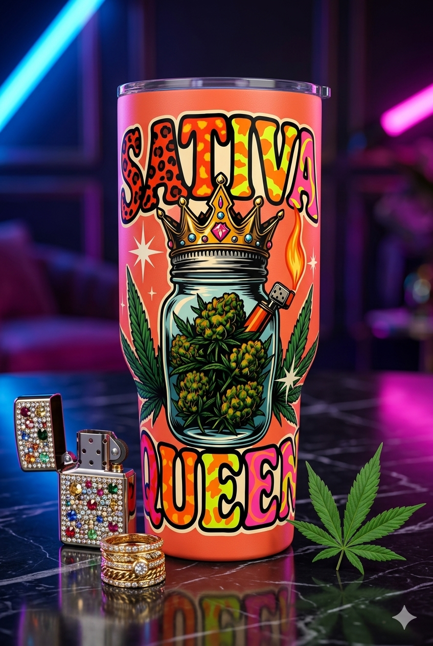 👑 Sativa Queen — Fierce and vibrant with red cheetah, orange leopard, neon yellow and hot pink swirl mixed-pattern letters. Features a jeweled gold crown sitting on a mason jar overflowing with detailed buds, cannabis leaves and a flaming lighter. Bold neon energy on a clean white background.