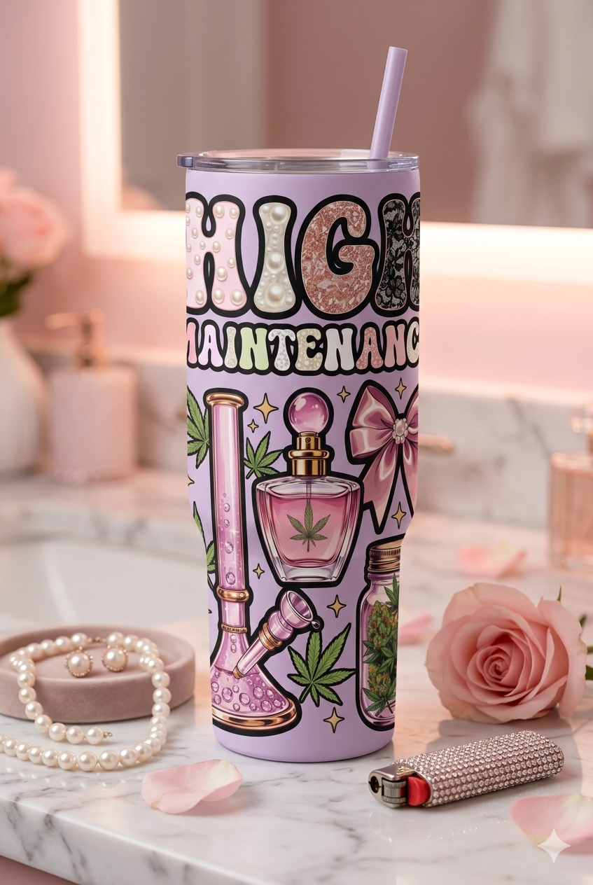 💗 High Maintenance — Coquette glam energy with pearl, rose gold glitter and black lace mixed-pattern letters. Features a pink bedazzled bong, cannabis perfume bottle, satin bow with pearl center and a bud-packed mason jar on a dreamy lavender background.