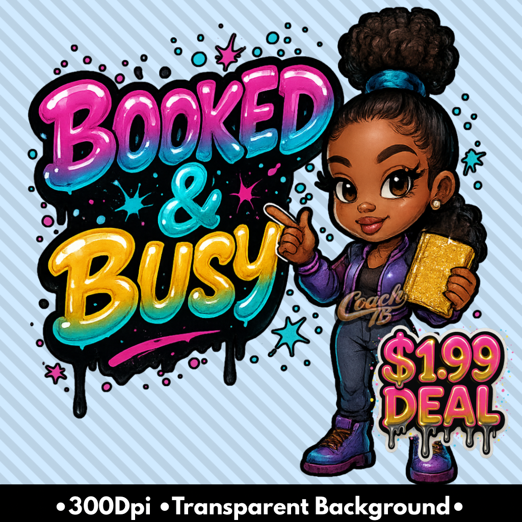 This dope chibi baddie PNG is part of our exclusive Plug Tuesday $1.99 drop — created for the bold, the boujee, and the unstoppable. Featuring a vibrant “Booked & Busy” graffiti design with neon pops and a confident urban chibi queen, this design brings instant energy to your projects.