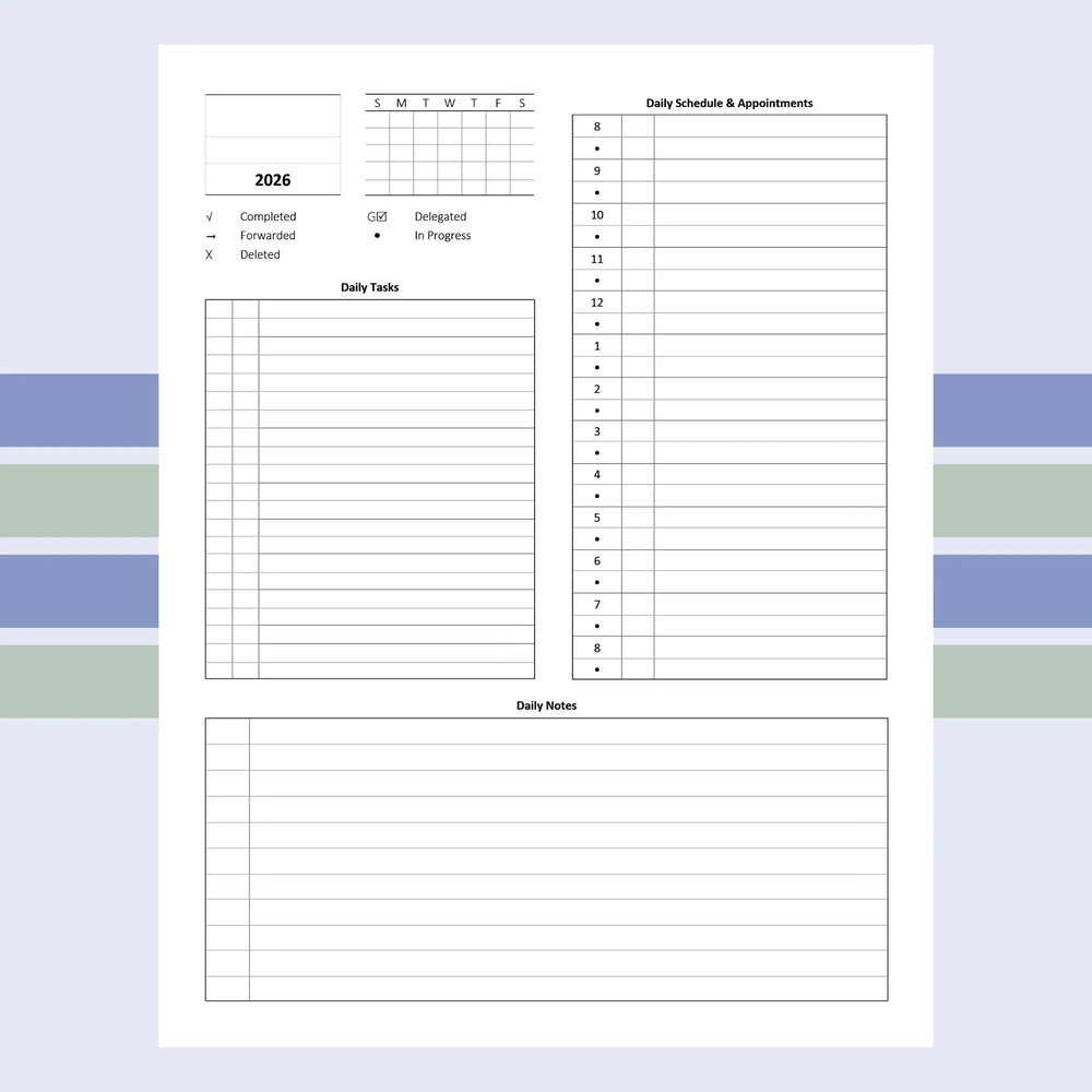 Undated Franklin-inspired day on one page compact planner inserts. Printable daily pages designed for letter paper, duplex printing, and facing pages.