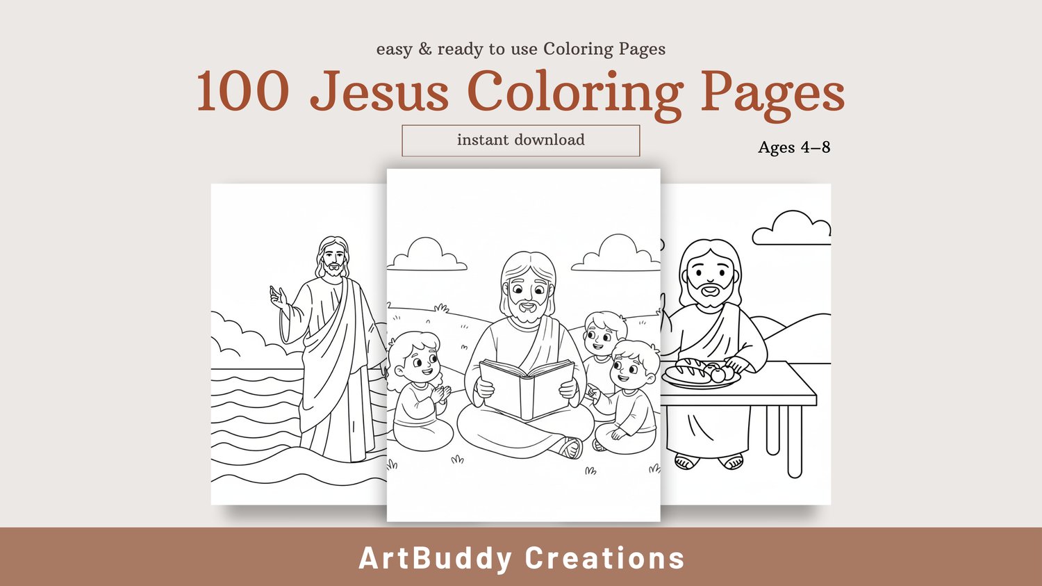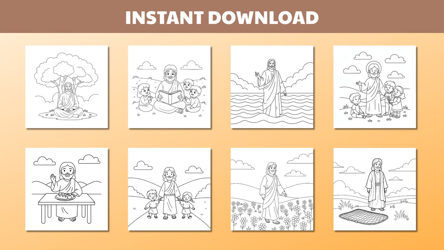 This bundle includes 100 faith-based coloring pages featuring Jesus in calm, loving, and child-friendly scenes. Every illustration is designed to be easy to color, peaceful, and suitable for children ages 4–8.