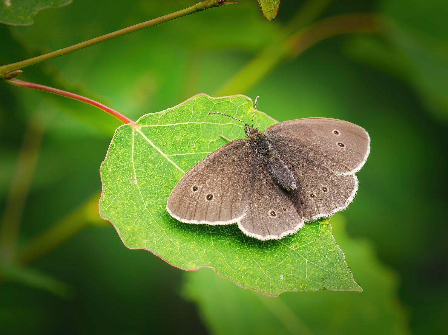 Beautiful butterfly (aphantopus hyperantus) is sitting on an alder leaf.