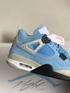 La Air Jordan 4 Retro University Blue a un upper en daim bleu ciel, accompagné d’un filet en TPE et de lacets assortis. Le design est complété par l’incontournable motif Cement Print sur les Wings, le talon et une bonne partie de la midsole. Un nouveau tag tricolore sur la languette apporte la touche finale.