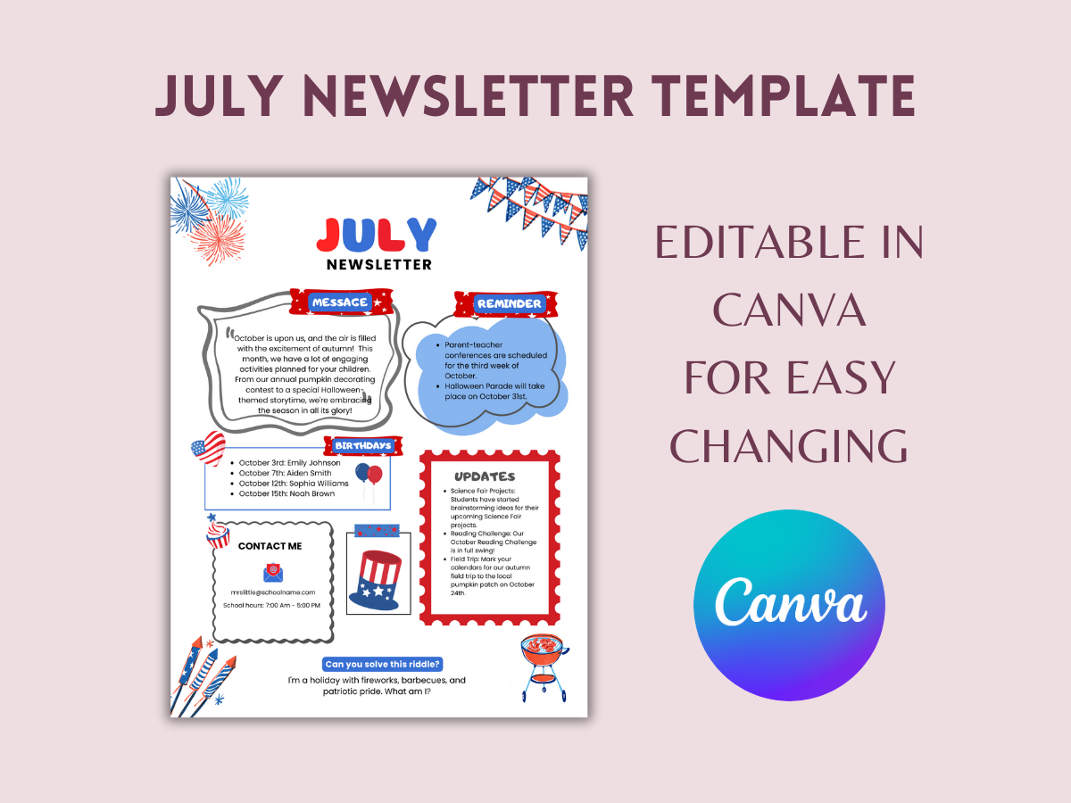 July Monthly Teacher Newsletter Canva Template is an easy-to-use template and customizable in Canva. Stunning newsletter templates are customizable using the free version of Canva. Designed for teachers, administrators, and PTA members, the School newsletter templates are perfect for anyone looking to add a touch of something different to their school communications. Whether you're announcing upcoming events, sharing important updates, or celebrating student achievements, these templates have you covered. Create monthly newsletters to keep parents informed about school events and activities. Our newsletter template bundle is perfect for preschools, PTA newsletters, daycares, homeschool, and church youth groups, and can be changed up for a community flyer.