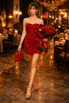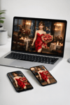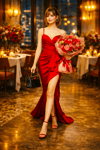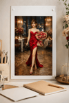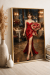 Featuring a meticulously tailored crimson dress, red ankle boots, jewelry accents, a luxury handbag and a bouquet of red roses, this artwork embodies a luxury editorial aesthetic perfect for romantic branding, digital décor and premium creative projects.
