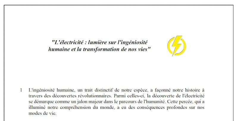 A reading exercise on the topic of ingenuity: “L’électricité: lumière sur l’ingéniosité humaine et la transformation de nos vies”. The text is about 350 words.