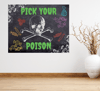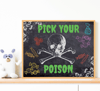 Pick Your Poison sign for halloween party or for trick-or-treaters. Black chalkboard style background with spooky letters and colorful minimalist vintage-theme illustrations in green, orange, white, red, and purple. Awesome sign to use for a candy/treats/bar/drink station during your event or to put by your front door! Simply download, print and hang or frame for fun and scary halloween decor! Trick or Treat!