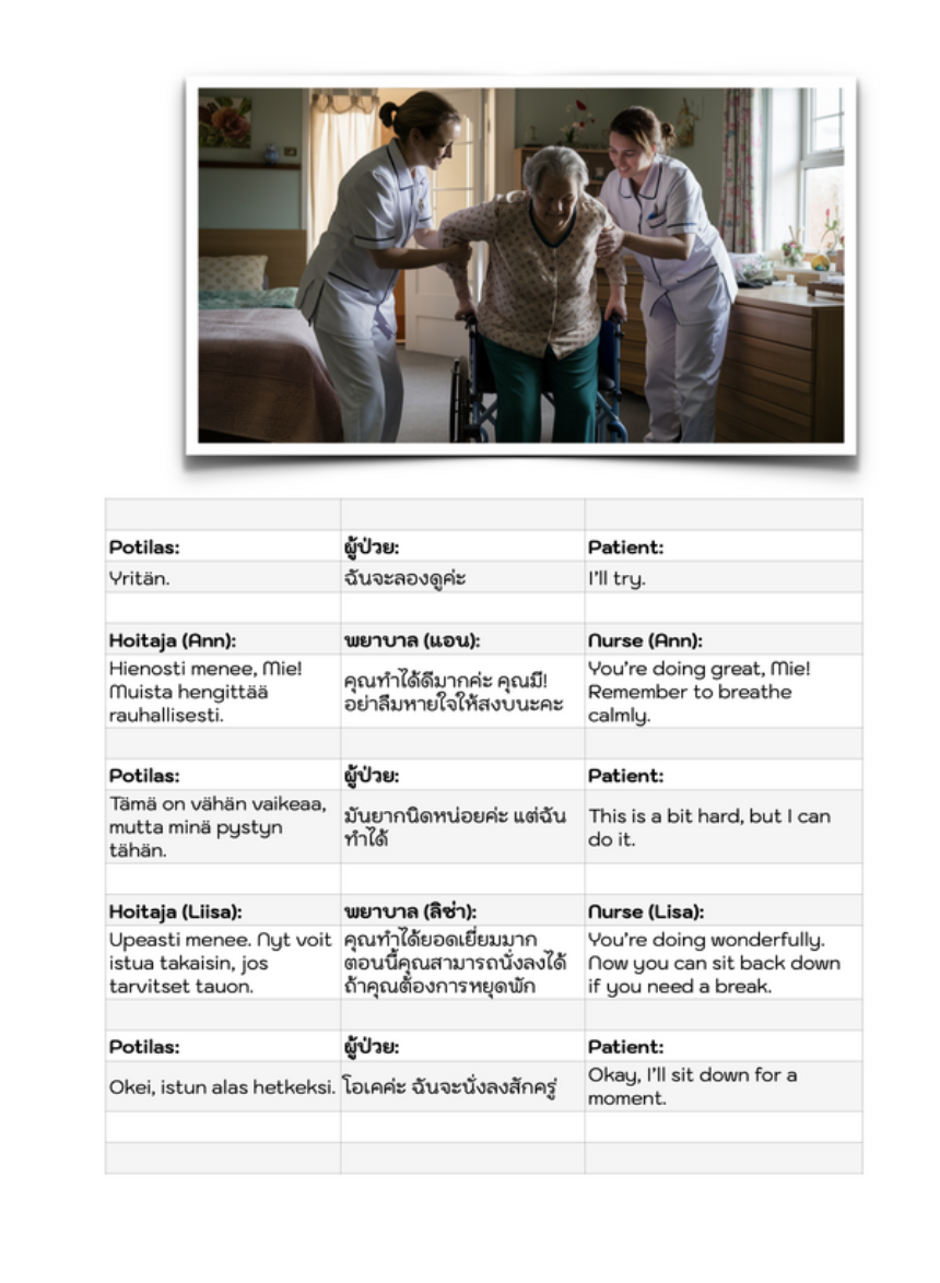 เป็นทรัพยากรที่ไม่เหมือนใครที่ออกแบบมาเพื่อสนับสนุนผู้ดูแลชาวไทยที่ทำงานในภาคส่วนดูแลผู้สูงอายุของฟินแลนด์ หนังสือเล่มนี้นำเสนอการผสมผสานระหว่างวลีและคำแนะนำในภาษาฟินแลนด์ ภาษาไทย และภาษาอังกฤษ เพื่อช่วยผู้ดูแลในการทำงานประจำวันและการโต้ตอบในสภาพแวดล้อมที่มีวัฒนธรรมหลากหลาย